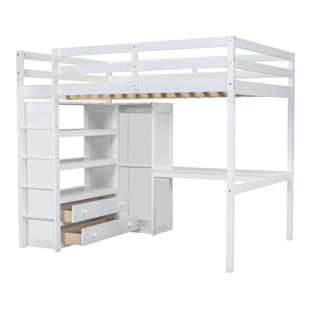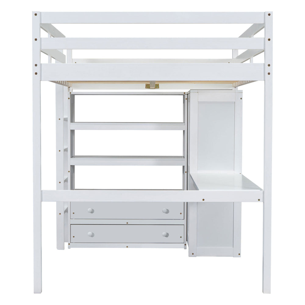 Revolutionize your bedroom with this versatile full-size loft bed crafted from sturdy pine wood and MDF. Designed to optimize space, the elevated bed frame creates room underneath for a built-in wardrobe with a smooth sliding door, a long work desk, and ample storage including 3-tier shelves and 2 drawers. This smart design supports a mattress up to 6 inches thick without the need for a box spring, making it perfect for small rooms or studio apartments. Safety is prioritized with full-length guardrails and a secure ladder, ensuring peace of mind. Measuring 79.5 inches long, 56.9 inches wide, and 67.5 inches high, this white loft bed brings functionality and style to your bedroom. Elevate your space and productivity today.