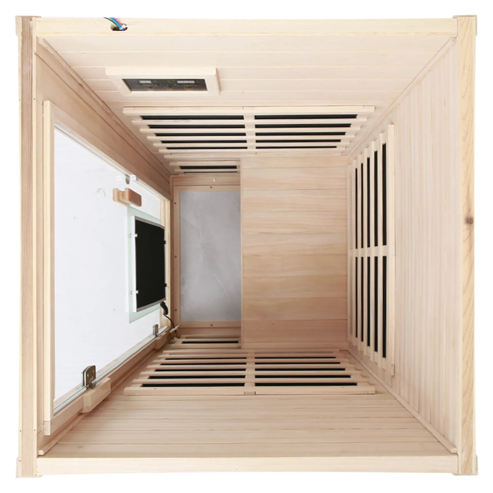 Step into your personal wellness retreat with this Far Infrared Hemlock indoor sauna room, expertly designed for one person. Crafted from solid Hemlock wood, it offers natural durability and a warm, calming ambiance. The far infrared heating panels gently penetrate to soothe muscles, boost circulation, and promote detoxification. Featuring an easy-to-use LCD touch control panel, you can set your optimal temperature between 77°F and 140°F (25°C to 60°C) with precise timing for customized comfort. The integrated Bluetooth audio system lets you enjoy your favorite relaxing tunes, while the LED reading light enhances your experience. Compact at 32.3 inches (82 cm) wide, deep, and 66.5 inches (169 cm) tall, this sauna fits conveniently indoors without sacrificing comfort. Elevate your self-care routine and embrace daily rejuvenation today.