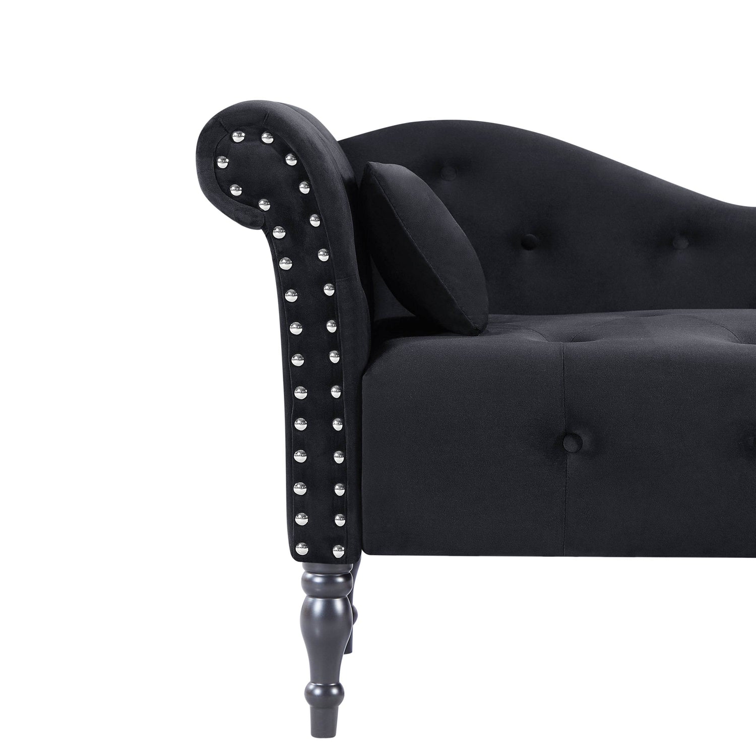Elevate your living or bedroom space with this elegant velvet chaise lounge, featuring a plush, medium-firm seat designed for cozy relaxation. The luxurious black velvet upholstery offers a soft, skin-friendly touch, while the decorative tufted buttons and nailhead trim add sophisticated style to any room. Crafted on a solid wood frame with sturdy turned legs, this chaise supports up to 300 lbs, ensuring durability and stability. Its backless and armless design encourages versatile seating positions, perfect for reading, napping, or unwinding after a busy day. Included is a supportive pillow to relieve neck and spine pressure, enhancing your relaxation experience. With easy assembly and a compact size of 60.6 inches long by 27.5 inches wide and 28.3 inches high, this chaise lounge is both practical and stylish. Transform your home comfort and ambiance—relax in style today.