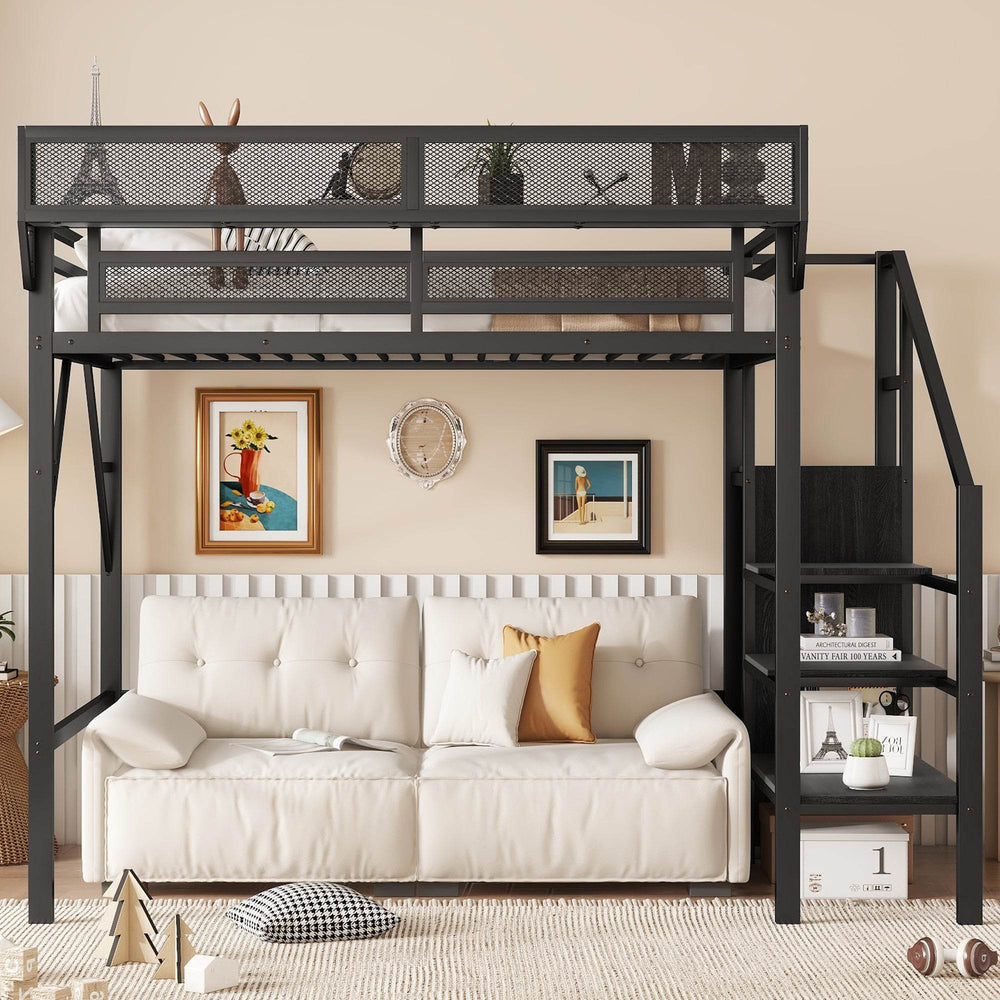 Designed for kids and teens, this twin size loft bed combines smart storage solutions with durable metal construction to create a functional and modern bedroom centerpiece. The high loft frame offers 54.3 inches of clearance underneath, perfect for adding a desk, sofa, or storage to maximize your room’s versatility. Integrated storage shelves next to the upper bed keep books and essentials within easy reach, while the staircase with built-in compartments adds both safety and extra organization space. A built-in wardrobe supports clothing and accessory storage, making this loft bed an all-in-one dorm or bedroom upgrade. Finished in sleek black metal, it balances strength and style, supporting up to 250 pounds for lasting stability. Elevate your living space with this multi-functional twin loft bed today.