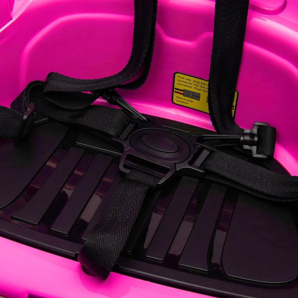 Give your child ages 1.5 to 5 years an unforgettable driving experience with this fun and safe 12V electric ride-on bumper car. Featuring a durable polyethylene body in vibrant rose pink, this compact car measures 25.6" long, 25.6" wide, and 19.3" high, perfectly sized for little drivers. The advanced dual-drive system with front and rear omni-directional wheels offers smooth movement and thrilling 360-degree spins. Parents can stay in control via the 2.4G remote, enabling safe guidance and playtime. Equipped with bright bilateral sequential LED lights and flowing light effects, it adds excitement while ensuring visibility. Safety is paramount with a five-point harness, full-circle anti-collision padding, and ASTM CPC certified construction. An integrated center console under the seat provides one-touch start, Bluetooth music, battery display, and speed options making every ride enjoyable. With up to 1 hour of playtime per charge, this ride-on car blends exhilarating fun with peace of mind. Elevate your child’s outdoor adventures today!