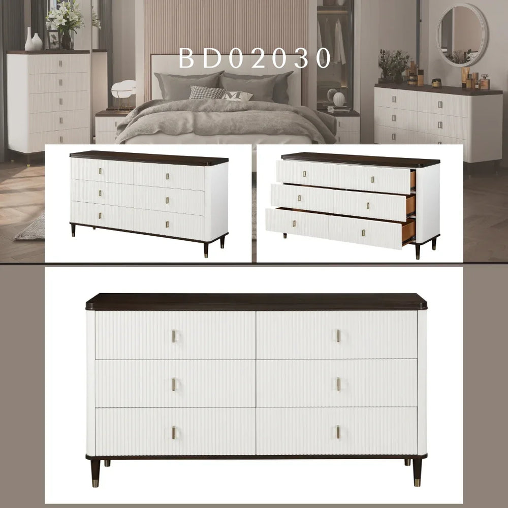 Bring timeless elegance and practical storage to your bedroom with the Carena dresser, featuring a stunning white and walnut finish that complements both classic and contemporary decor. Crafted from durable synthetic wood including poplar, MDF, and walnut veneer, this dresser offers lasting style and resilience. The felt-lined top drawer with an integrated jewelry tray provides a secure, gentle space for your delicate accessories, keeping them organized and easily accessible. With spacious drawers designed to accommodate a variety of clothing and essentials, this dresser streamlines your space while adding a sophisticated touch. Its generous dimensions—67 inches wide, 36 inches high, and 18 inches deep—make it a versatile and impactful furniture piece. Elevate your bedroom storage and style today with the Carena dresser.