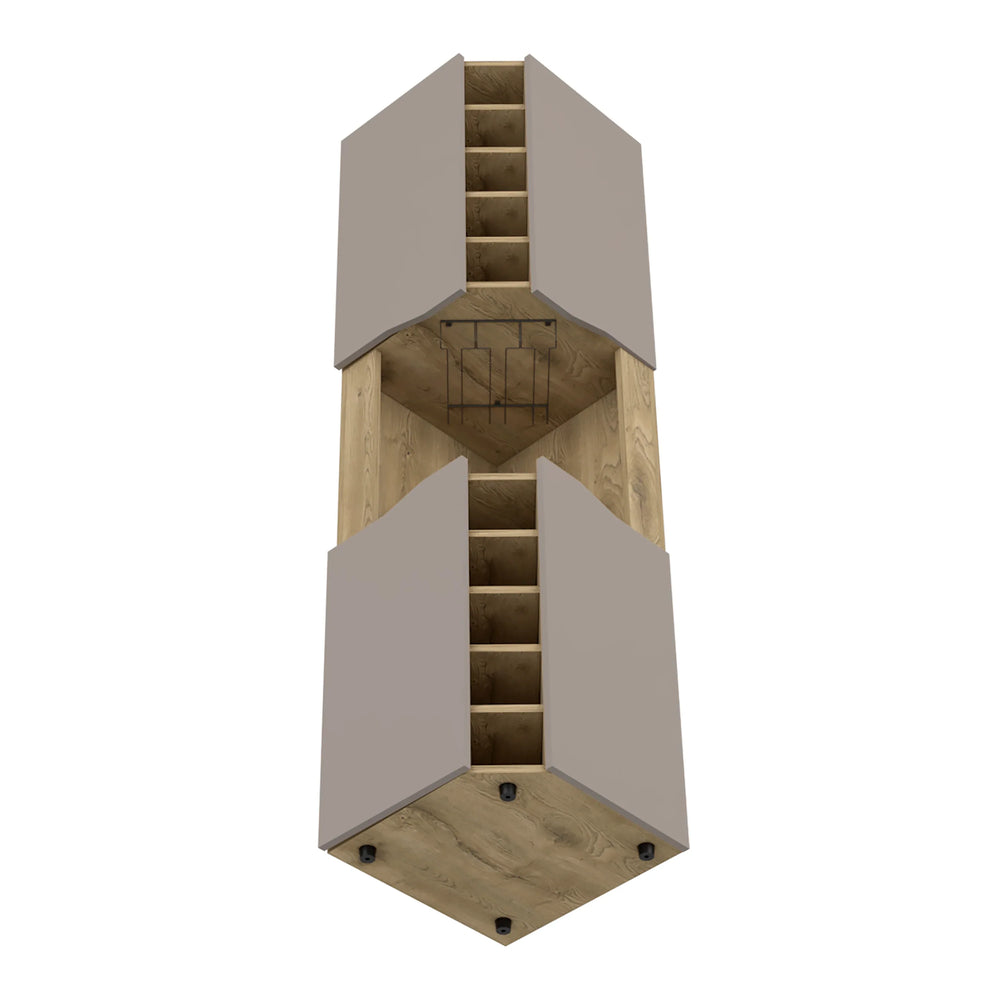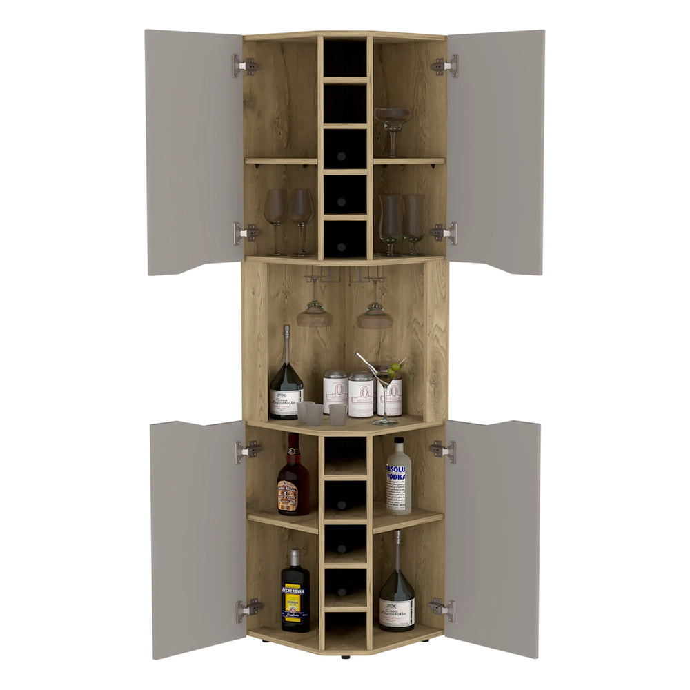 Upgrade your kitchen or dining space with the modern Obregon Corner Bar Cabinet, crafted to combine style and functionality. Featuring a sleek macadamia and taupe finish, this cabinet fits perfectly in corner spaces, optimizing storage without crowding your room. The ten built-in wine racks hold your favorite bottles securely, while the cup rack keeps glassware organized and easily accessible. A spacious top shelf measuring 17.7 inches (45 cm) wide by 17.7 inches (45 cm) deep offers the perfect spot for mixing drinks or displaying decor. Four independent one-door cabinets provide additional hidden storage, helping you maintain a clean and organized space. Constructed from reliable particle board, this bar cabinet balances durability with a contemporary design. Weighing 111 pounds and standing 71.7 inches (182 cm) tall, it offers sturdy presence and ample storage without overwhelming your kitchen corner. Elevate your entertaining area today with this stylish and practical corner bar cabinet.