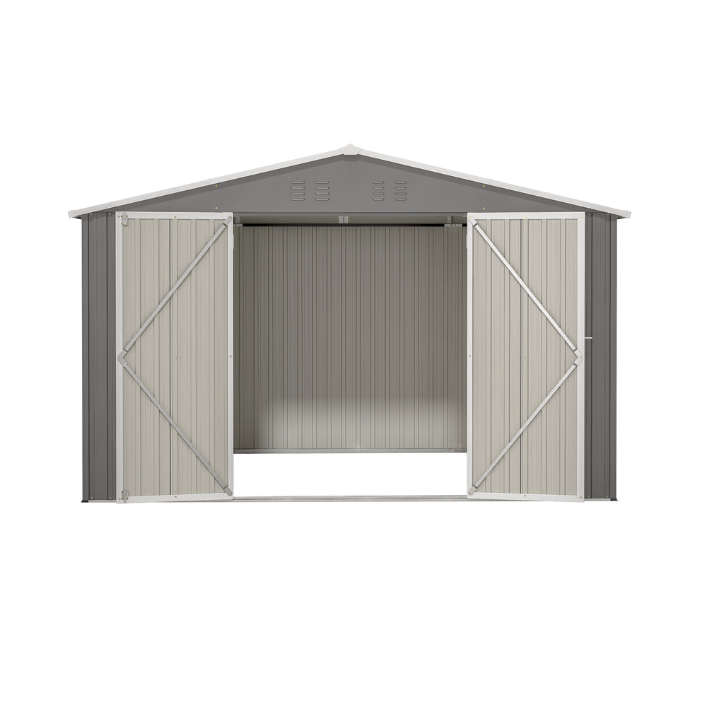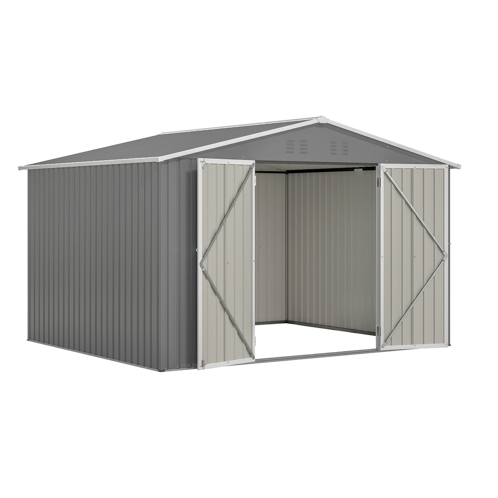 Organize your garden, patio, or backyard efficiently with this spacious 10-foot by 8-foot outdoor storage shed. Crafted from durable galvanized steel with a rust- and UV-resistant finish, it’s built to withstand all weather conditions year-round. The steep, pitched roof ensures rain and snow slide off effortlessly, while ventilation vents promote airflow to prevent moisture build-up and keep your stored items dry. Featuring lockable doors measuring over 50 inches wide and 60 inches high, this shed secures your tools, lawnmowers, bicycles, and more. The roomy interior offers versatility, doubling as a pet shelter or garbage enclosure, helping you declutter and maintain your outdoor space. Easy to assemble with pre-cut, pre-drilled panels and clear instructions, this shed is a perfect addition for durable and convenient outdoor storage. Elevate your yard’s functionality today.