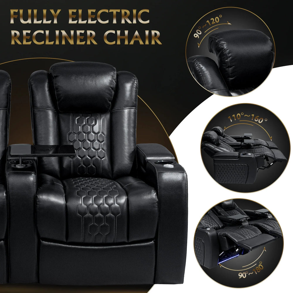 Sink into ultra-plush comfort with this premium genuine leather power recliner, crafted from rich Top-Grain Nappa leather. Equipped with advanced Comfort-Matrix Technology, it combines memory foam, cooling gel, springs, and support foam to provide ergonomic support while keeping you cool during extended seating. The fully adjustable lumbar support and headrest let you customize your seating position for maximum relaxation, ideal for movie nights or unwinding after a long day. Stay connected with smart charging ports featuring fast 18W USB-C and USB-A outputs, conveniently built into the sleek black chrome armrest. Dynamic RGB LED lighting with 10 vibrant colors enhances your entertainment space, and illuminated cupholders ensure beverages are always within easy reach. Smooth air-piston-powered storage arms offer hidden space for remotes or snacks, rounding out this stylish, versatile theater recliner. Elevate your home comfort and entertainment setup today.