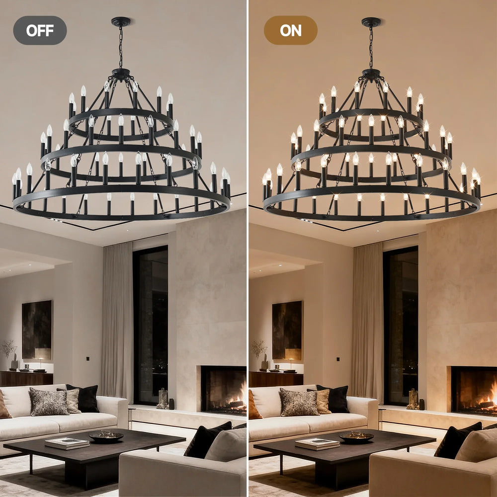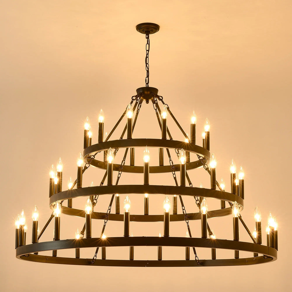 Make a bold statement in your living, dining, or foyer space with this stunning 53-inch (135 cm) 54-light farmhouse chandelier. Crafted from durable iron and metal in a matte black finish, its unique wagon wheel design blends American traditional and contemporary styles seamlessly. The three-tier structure offers expansive 360° illumination, creating a warm, inviting ambiance perfect for high ceilings and spacious rooms. Adjustable chains allow you to customize the hanging height to suit your space, while compatibility with various E12 bulbs (not included) provides versatile lighting options to match your desired mood. Easy to install and maintain, this large rustic chandelier transforms any room with charm and brightness. Elevate your home lighting today and enjoy timeless style combined with practical function.