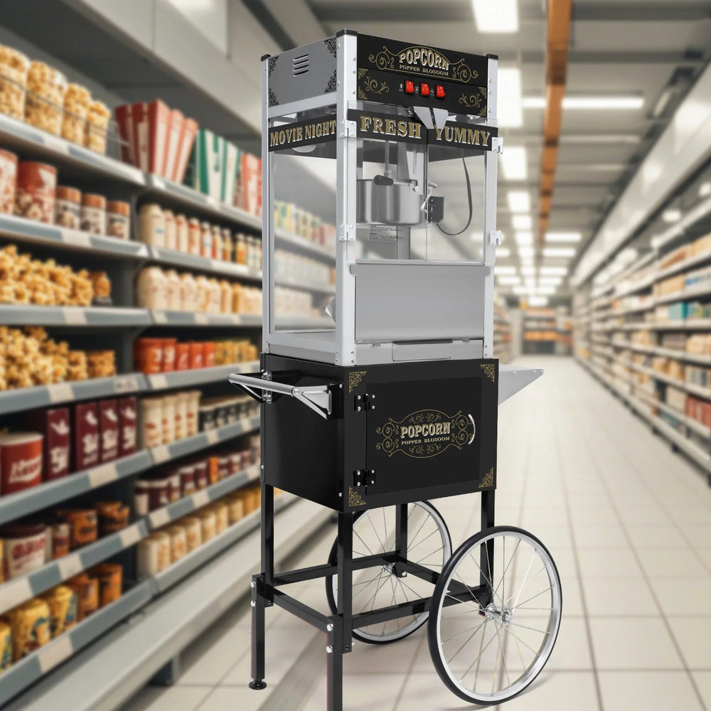 Bring the authentic movie theater experience to your home, business, or event with this vintage-style commercial popcorn machine. Crafted from durable stainless steel with a sleek black finish, it features a powerful 1440W kettle with a 20-ounce (591 ml) capacity, ensuring fresh, hot popcorn in every batch. The machine sits on a sturdy cart equipped with large 16-inch bicycle-style wheels for easy mobility, while the tempered safety glass provides a clear view of the popping process and protects against heat and breakage. With a built-in warming deck and intuitive 3-switch control panel, you can effortlessly pop, stir, and keep your popcorn warm and fresh—perfect for home theaters, parties, school events, and concessions. Elevate your snacking experience today with this reliable and stylish popcorn popper.