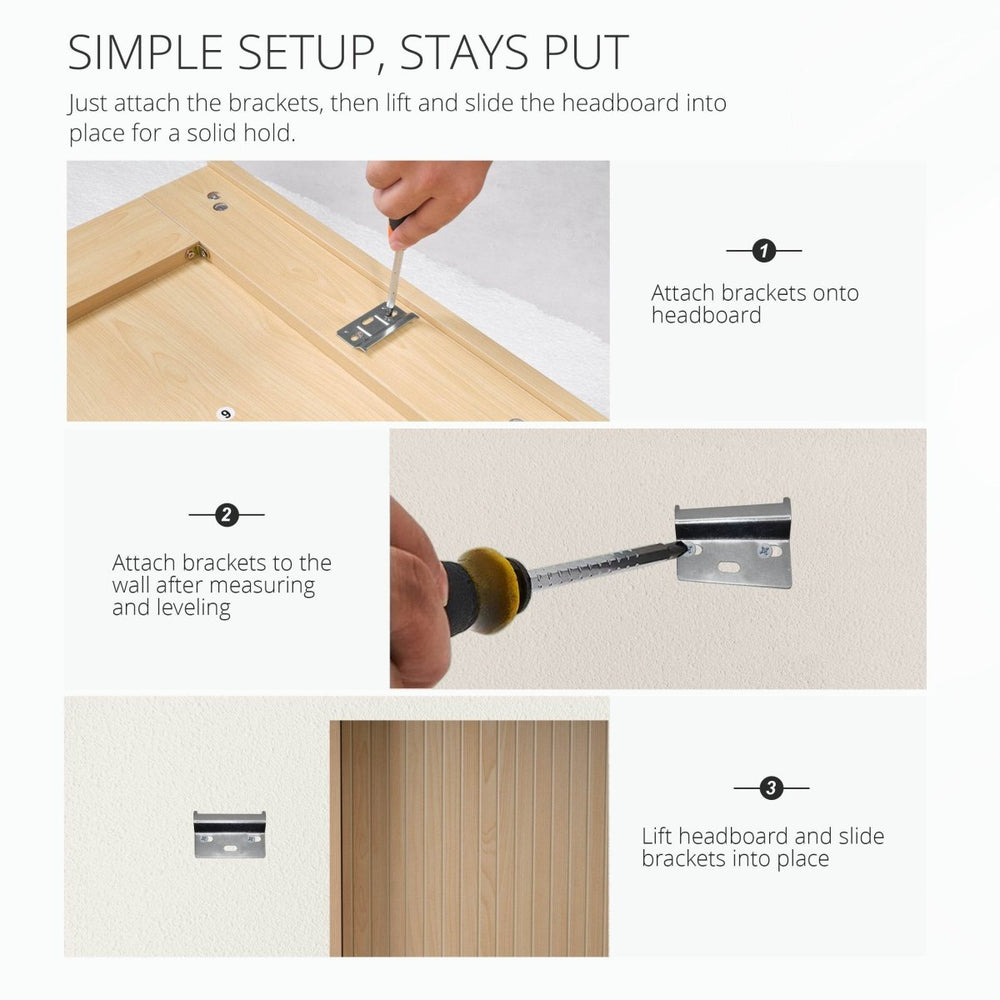 Wood headboard features a realistic wood grain and contemporary 3D carving design, crafted from solid wood and MDF for durability and stability. Easy to assemble, it adds natural style and sturdy support to bedroom decor.