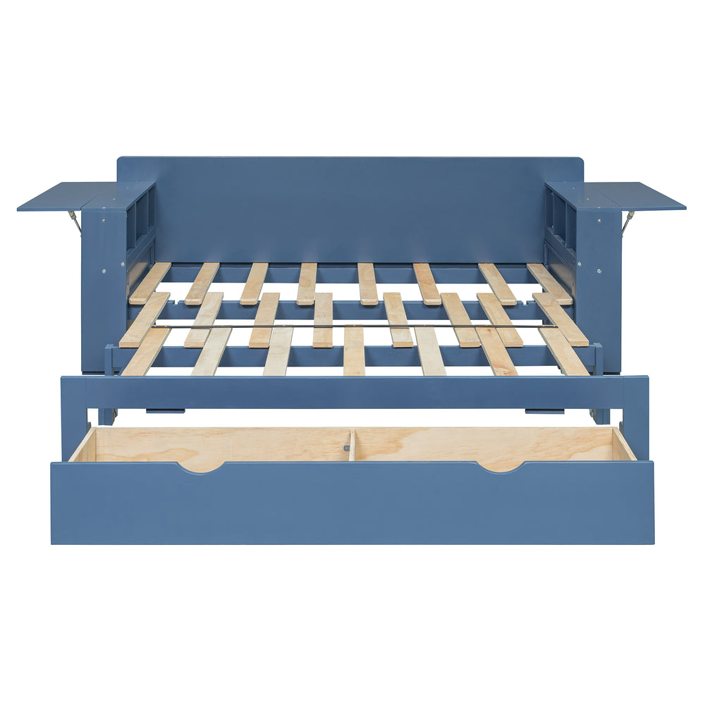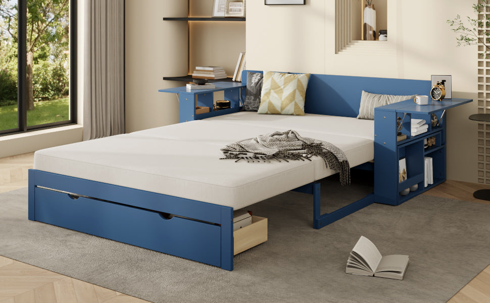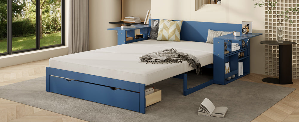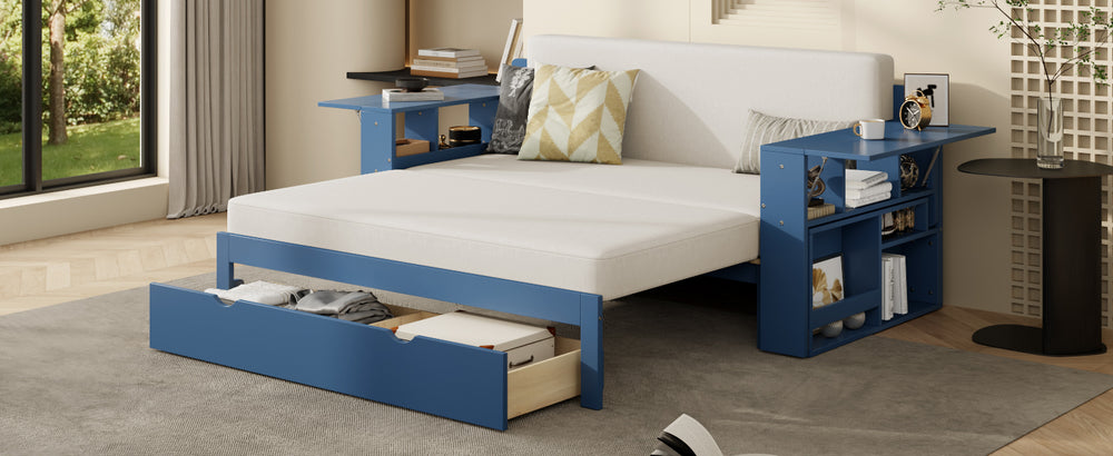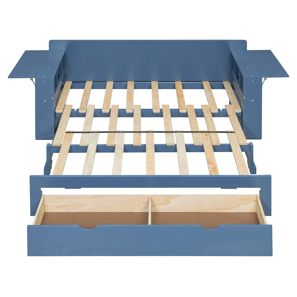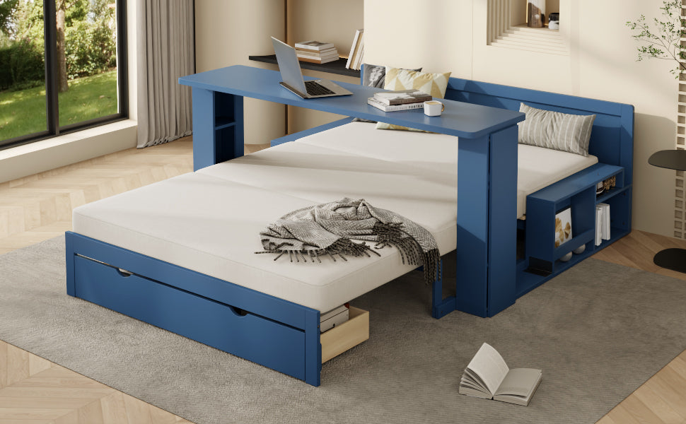 This full-size multifunctional daybed combines sofa, bed, desk, and storage into one space-saving design, featuring a removable desk, ample drawer and armrest compartments, and hydraulic side tables. Ideal for small apartments, guest rooms, or home offices needing versatile comfort and organization.