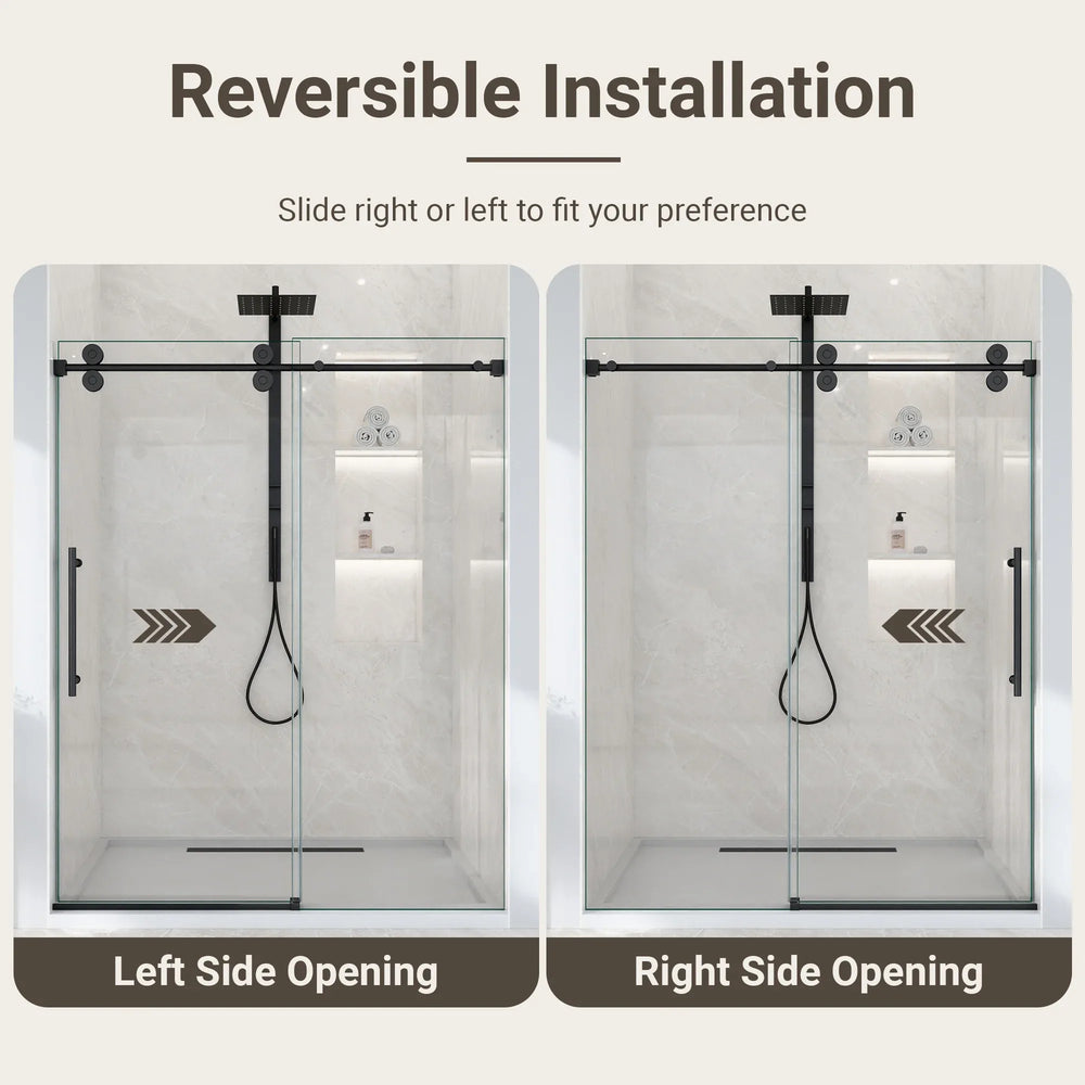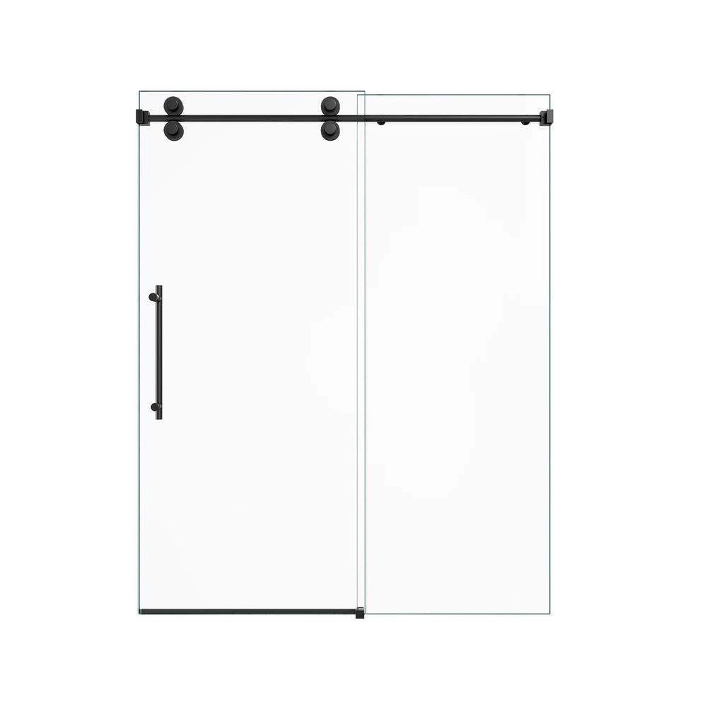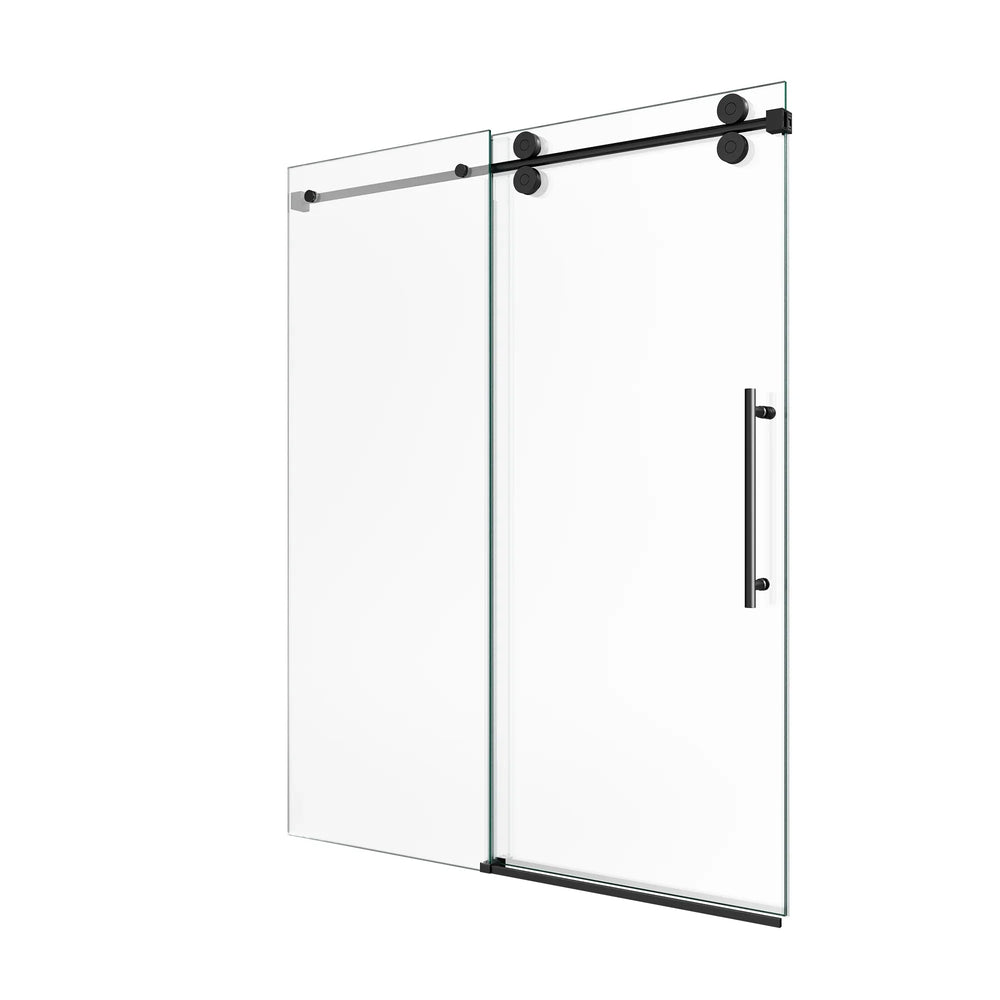 Upgrade your bathroom with this stunning frameless single sliding shower door, featuring crisp 5/16-inch (8mm) clear tempered glass and a contemporary matte black finish. Its borderless design creates a spacious, open feel while eliminating hard-to-clean edges for hassle-free upkeep. Engineered with premium 304 stainless steel rollers and an advanced anti-detachment system, it offers smooth and whisper-quiet operation. The durable round track with integrated water drainage protects against corrosion and mineral buildup, ensuring long-lasting performance. Complete with double waterproof sealing, this shower door keeps your bathroom dry and quiet during use. Designed with ergonomic stainless steel handles, this 60-inch wide by 72-inch high door brings both style and practicality to your space. Elevate your bathroom today with this sophisticated and reliable sliding shower door solution.