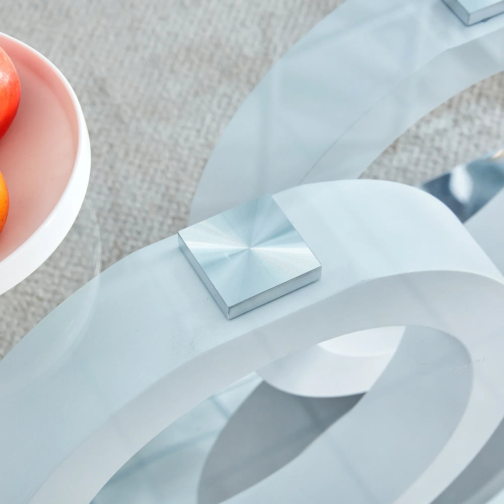 Contemporary glass coffee table features a clear glass top and stable MDF base with a modern minimalist design. Its circular support adds artistic flair, while easy cleaning and versatile use suit living rooms, studies, or bedrooms for stylish, functional decor.