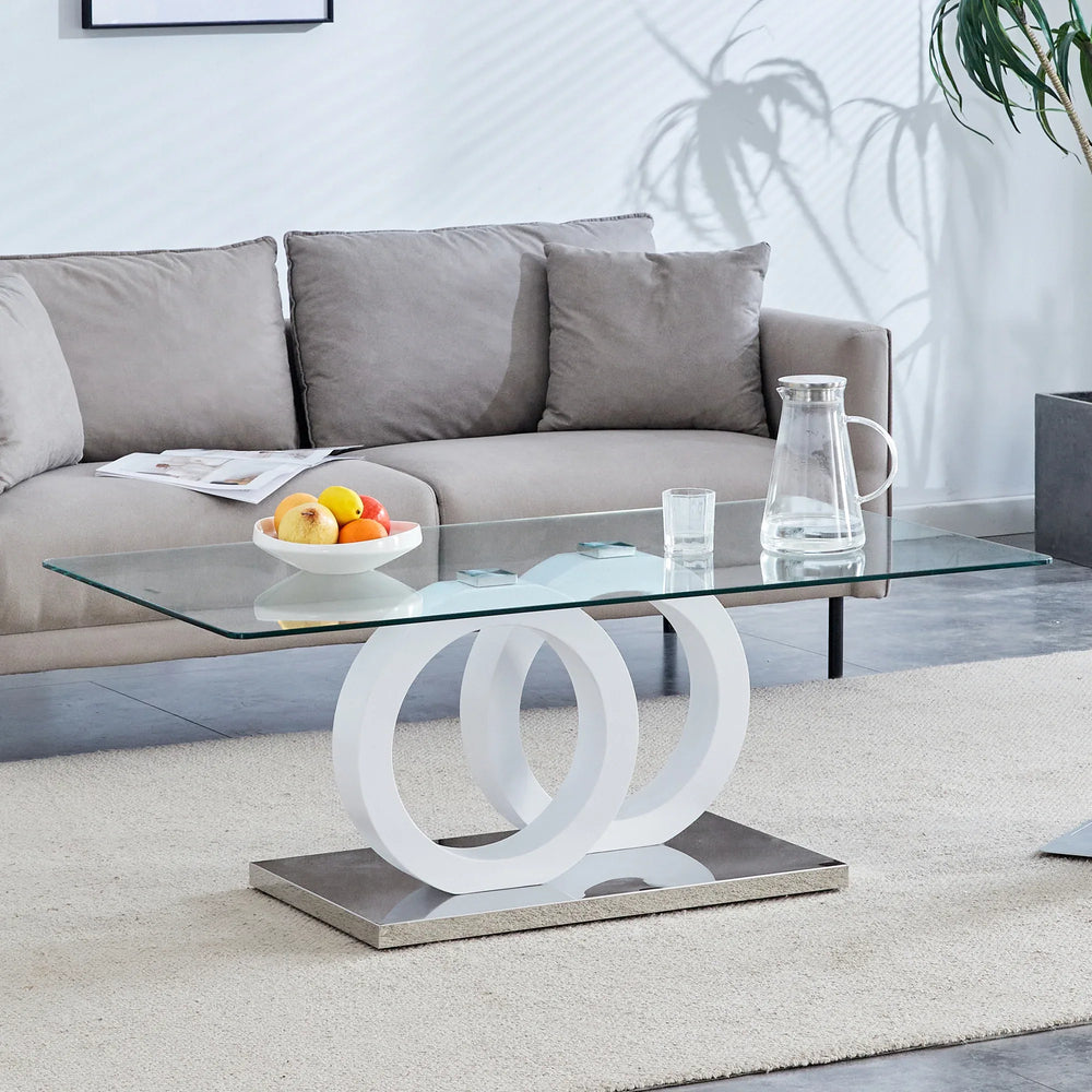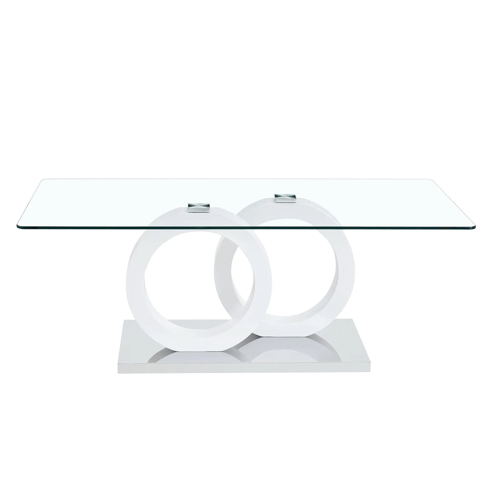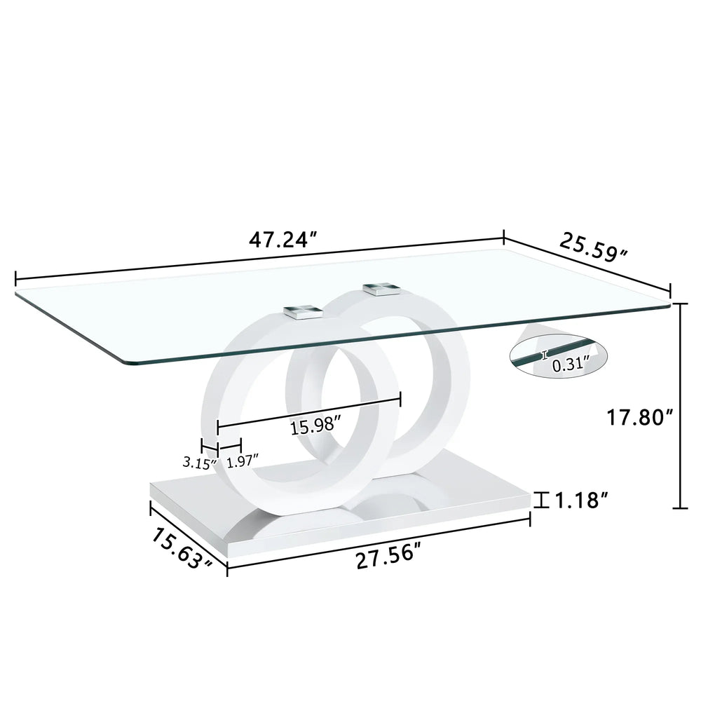 Bring modern sophistication and practical style into your home with this contemporary glass-top coffee table. Featuring a sleek clear glass surface, it visually expands your living room, making the area brighter and more spacious. The sturdy white MDF base provides durable support while adding a crisp, clean contrast. The unique circular support design merges function and art, creating a striking centerpiece that complements minimalist, Scandinavian, or industrial décor. Its versatile size of 47.2 inches long by 25.6 inches wide and 17.8 inches high makes it ideal as a central coffee table or a stylish accent in your study or bedroom. Designed for easy assembly and effortless maintenance, this coffee table is perfect for those seeking both form and function. Upgrade your home ambiance with this statement piece today.