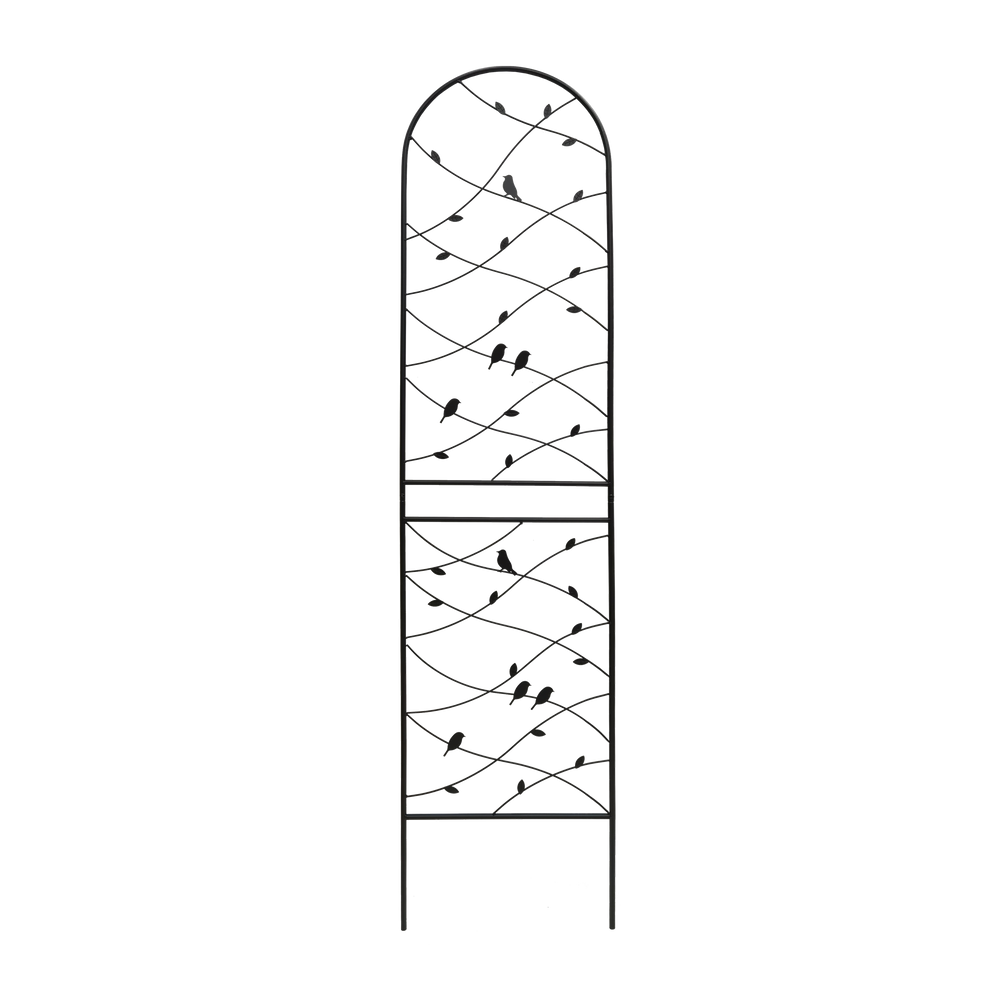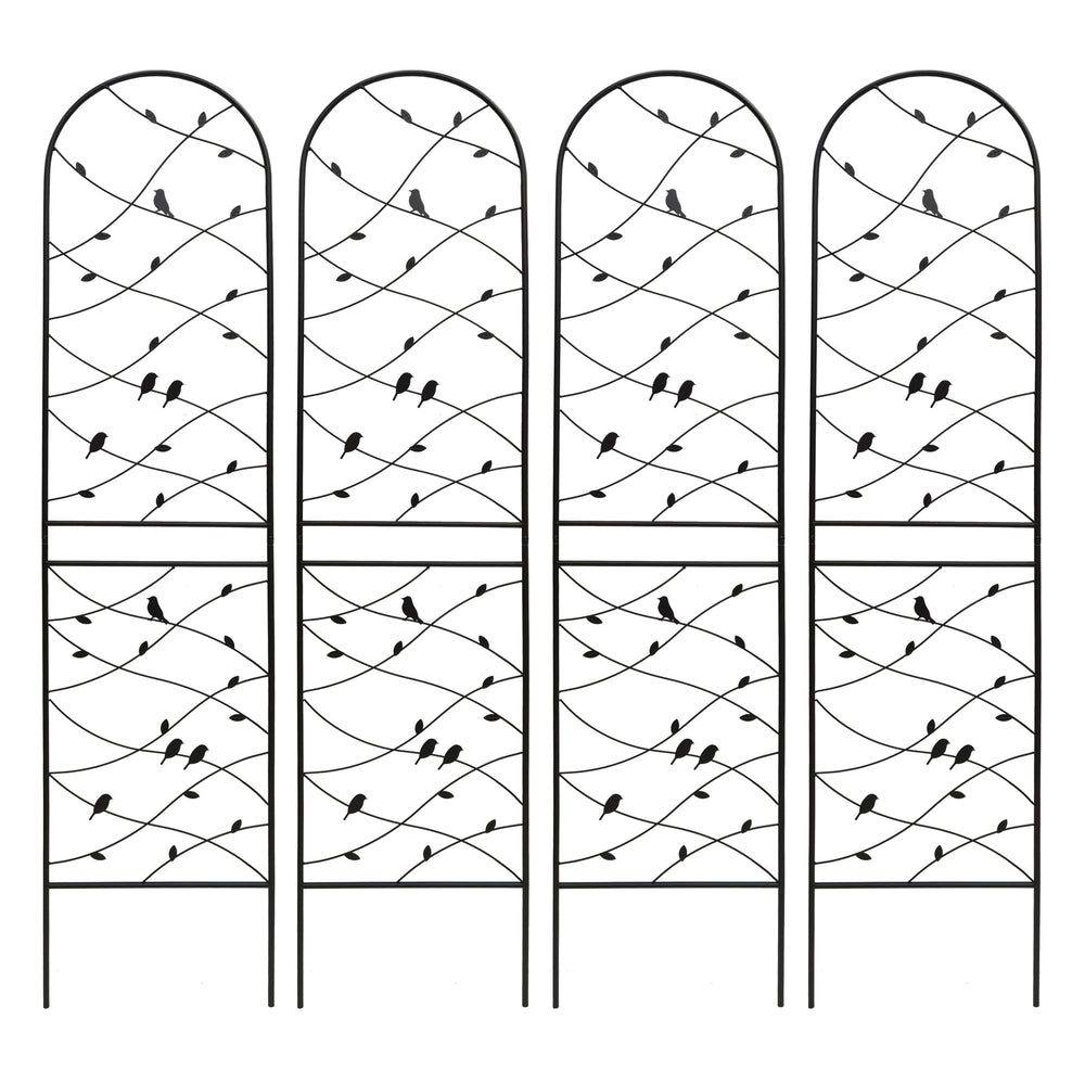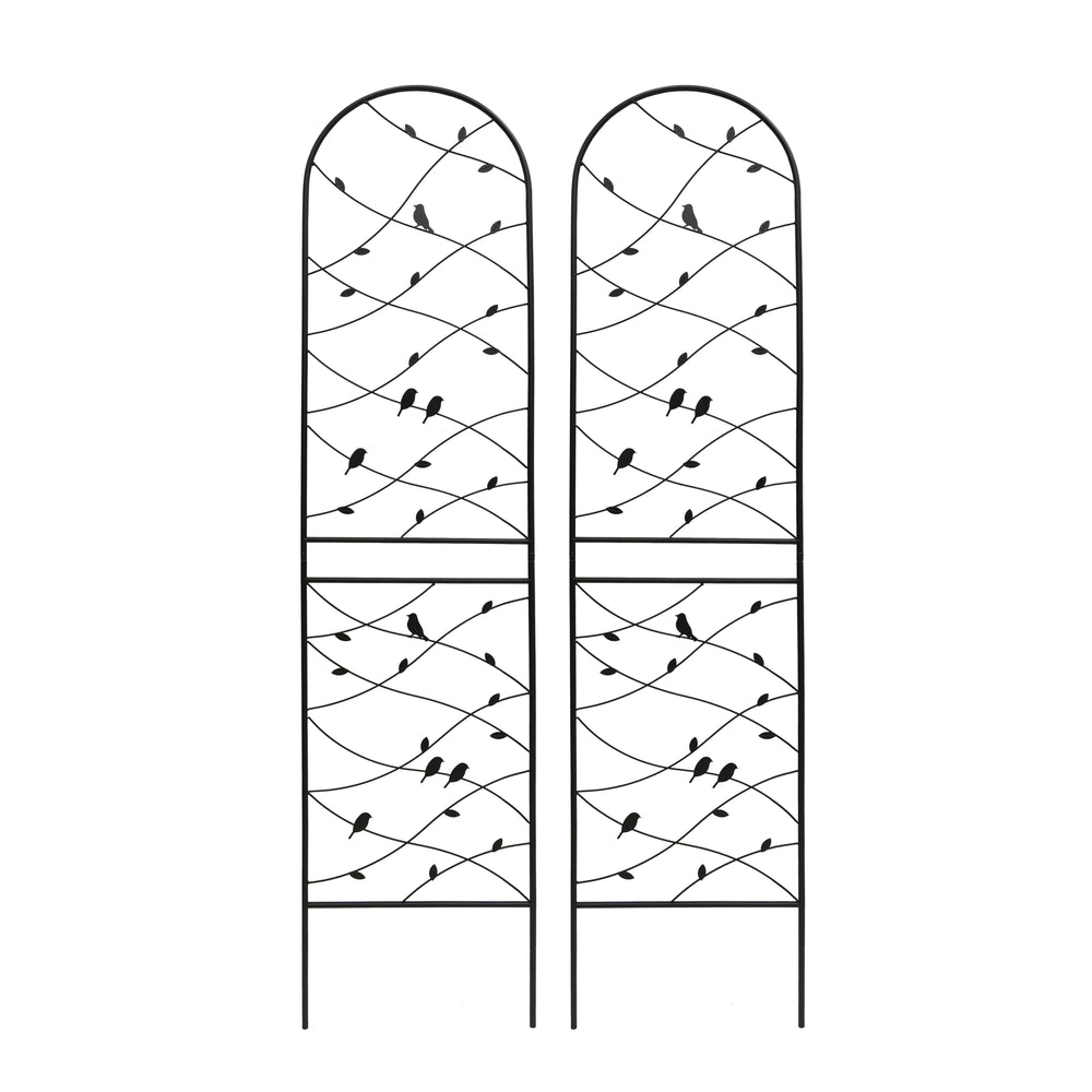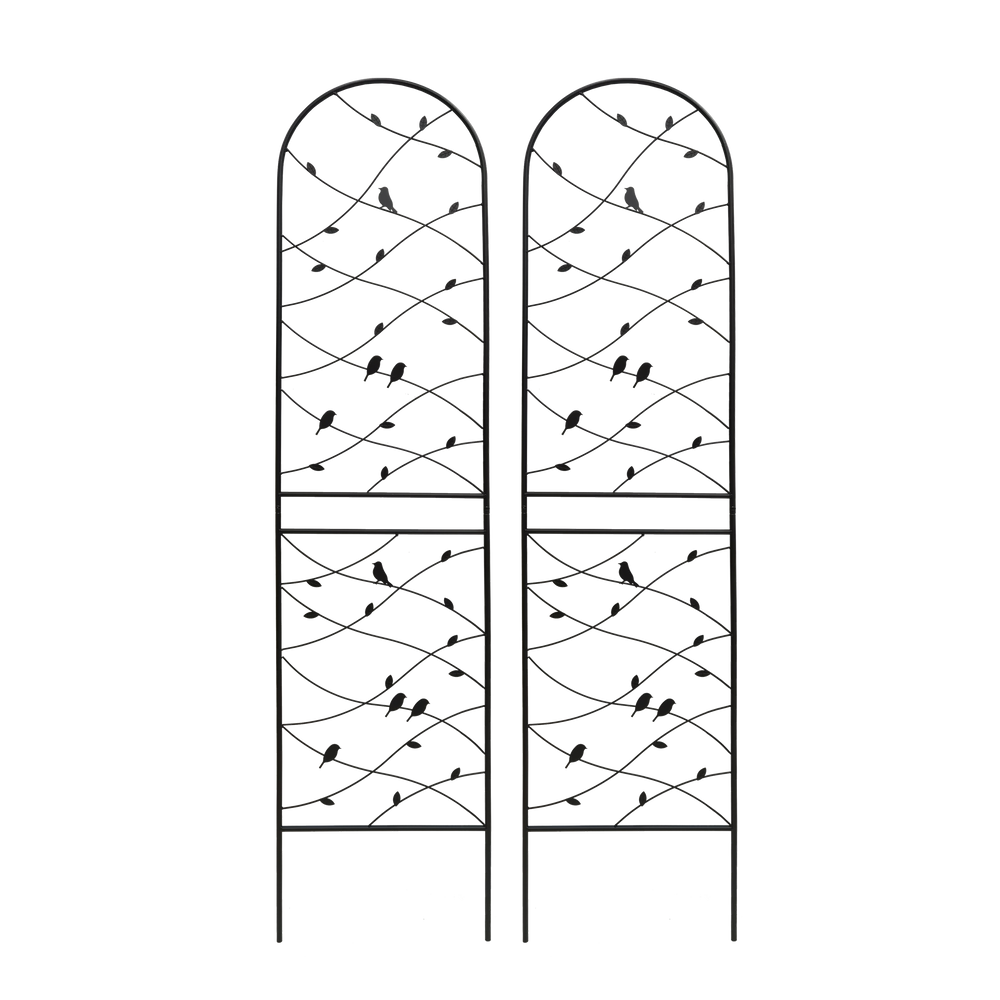 Durable black iron garden trellis set supports climbing plants with rustproof galvanized metal and powder coating for outdoor use. Easy to assemble with pre-cut, pre-drilled holes, ideal for enhancing garden aesthetics and plant growth.