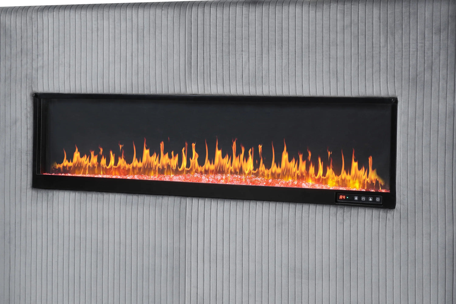 Elevate your bedroom with this stunning Queen-size wooden bed featuring plush gray velvet upholstery for a soft, inviting touch. The sleek modern design combines solid wood and MDF construction, ensuring long-lasting durability and stability. Built for both style and functionality, the bed’s tall velvet-padded headboard creates a sophisticated focal point while adding cozy comfort. Integrated ambient lighting with a customizable electric fireplace display enhances the room’s atmosphere without heat, perfect for setting a relaxing mood. Stay connected and entertained with built-in Bluetooth speakers and dual USB ports on each side of the headboard, letting you easily charge devices and enjoy your favorite music right from your bed. Designed with convenience in mind, this slat-style bed frame requires no box spring, simplifying setup and maximizing support. Transform your sleep space with innovation and elegance—upgrade your bedroom ambiance and comfort today.