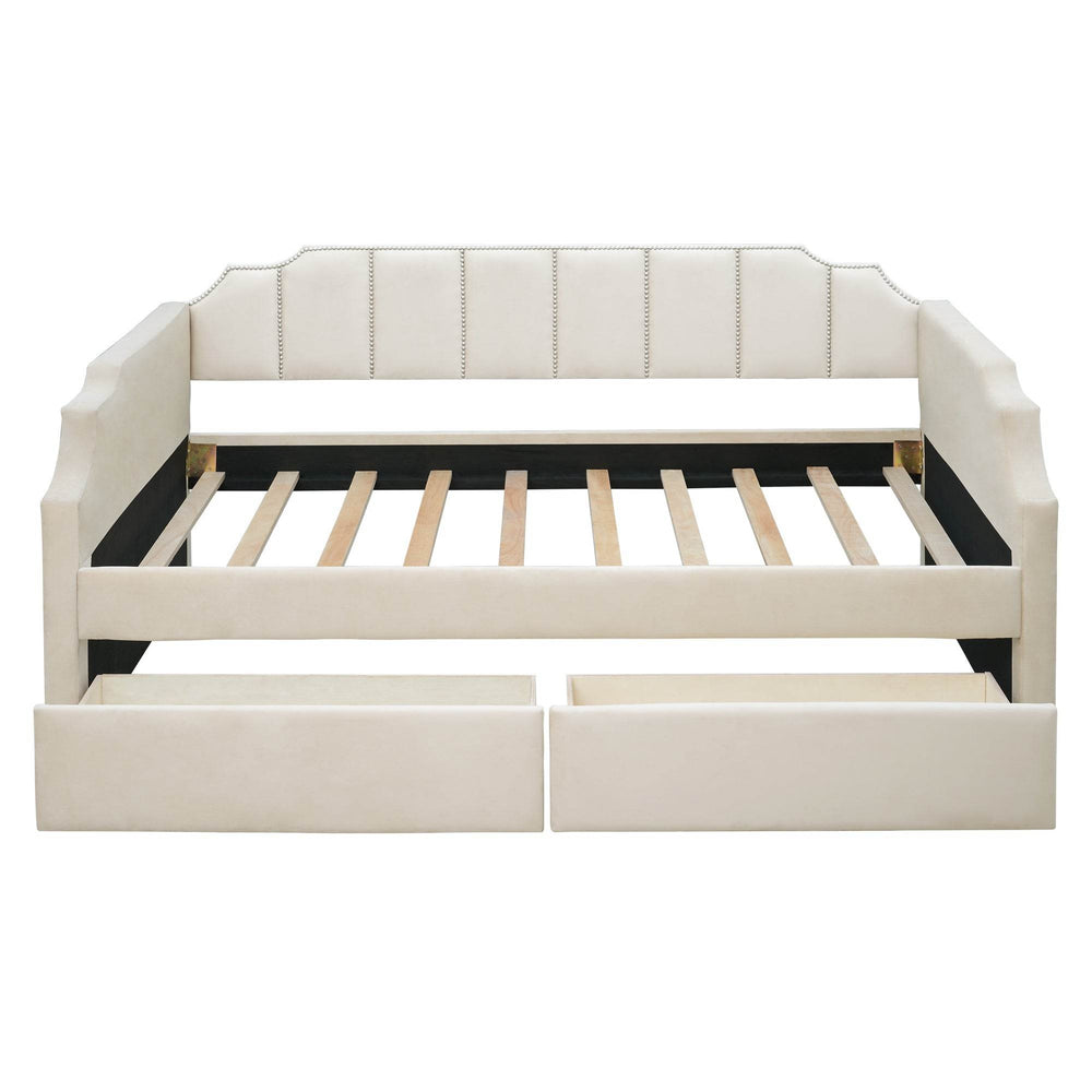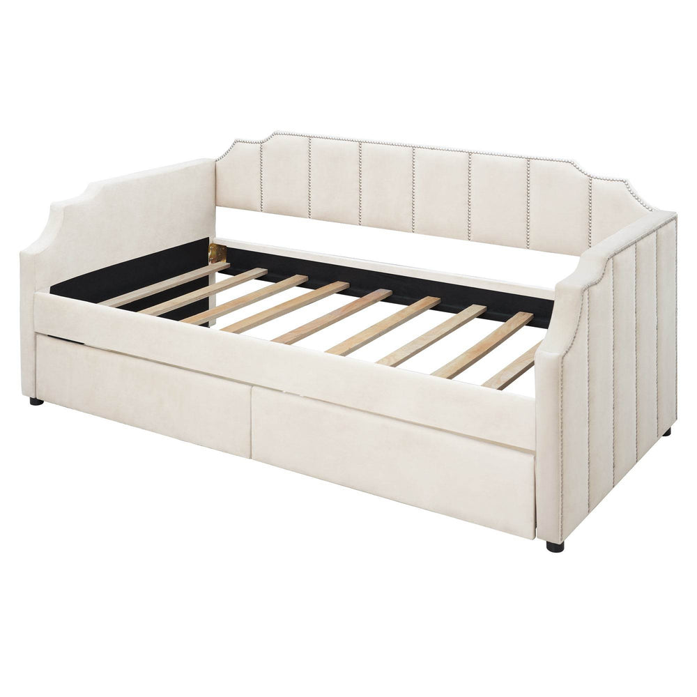 Discover the perfect blend of style and functionality with this twin size upholstered daybed. Featuring a plush velvet fabric in beige, this daybed creates a cozy and elegant seating or sleeping area ideal for guests or children. The sturdy wood slat support eliminates the need for a box spring, ensuring strong and lasting comfort. Two spacious drawers underneath provide ample storage for toys, bedding, or essentials, helping you keep your room organized and clutter-free. Crafted with a durable plywood frame and solid pine legs, it offers stability that lasts. Its compact design, measuring 79.1 inches long by 40.6 inches wide and 36.6 inches high, fits seamlessly in smaller spaces without sacrificing style. Whether used as a sofa or a bed, this daybed enhances your living space with timeless elegance. Elevate your home’s comfort and convenience today.