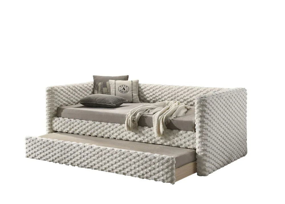 Perfectly blending style and functionality, this transitional twin daybed with a pull-out trundle offers a versatile seating and sleeping solution for your primary living area. Crafted from durable engineered wood and wrapped in soft, fur-like 100% polyester fabric, it provides both comfort and lasting quality. The crisp white finish and clean lines complement any décor, while the mattress-ready design allows you to add your own twin mattress effortlessly. Ideal for accommodating guests or creating a cozy nook, the roller slat trundle rolls out smoothly to reveal an additional sleeping surface without taking up extra space. Supported by sturdy plastic legs and offering simple assembly, this daybed is a smart, space-saving choice that elevates your room’s style and function. Elevate your relaxation and save space today.