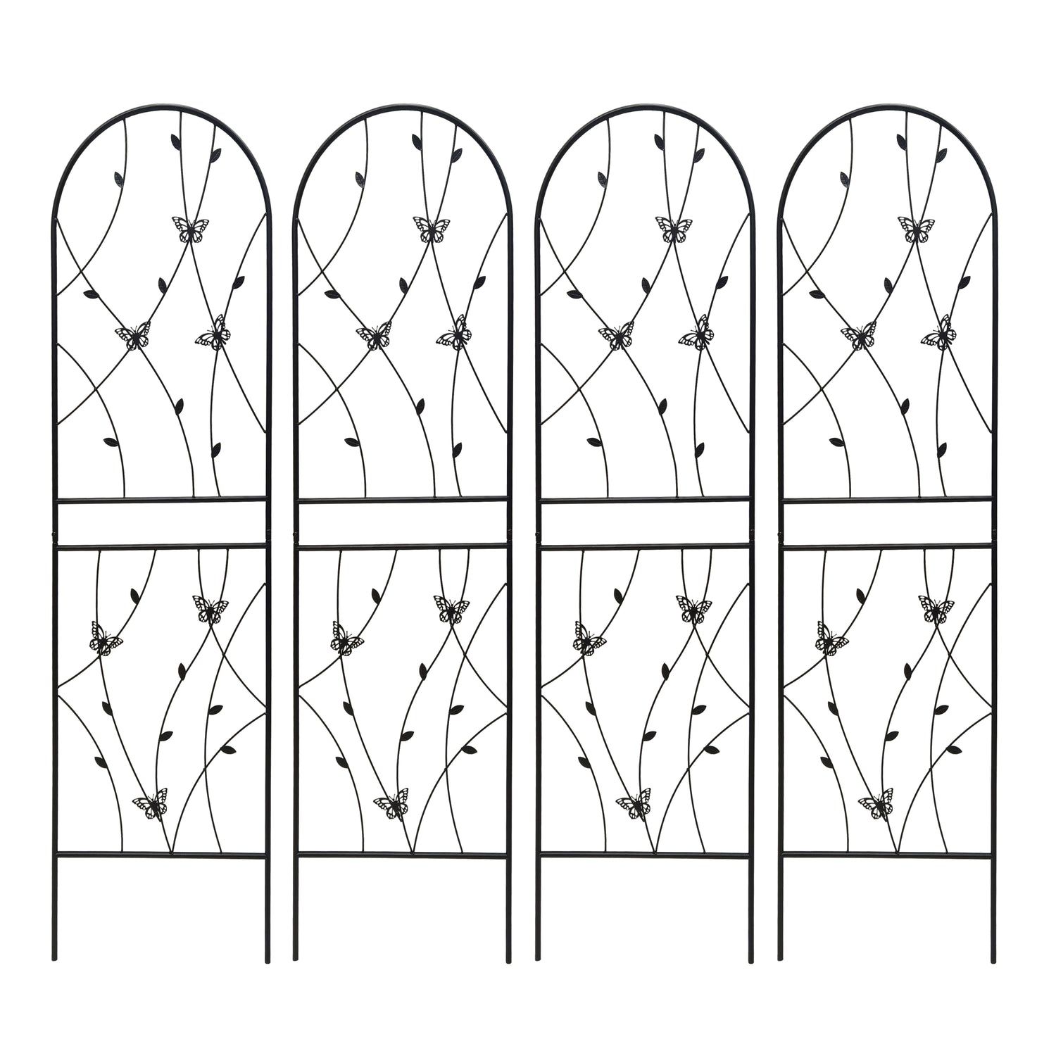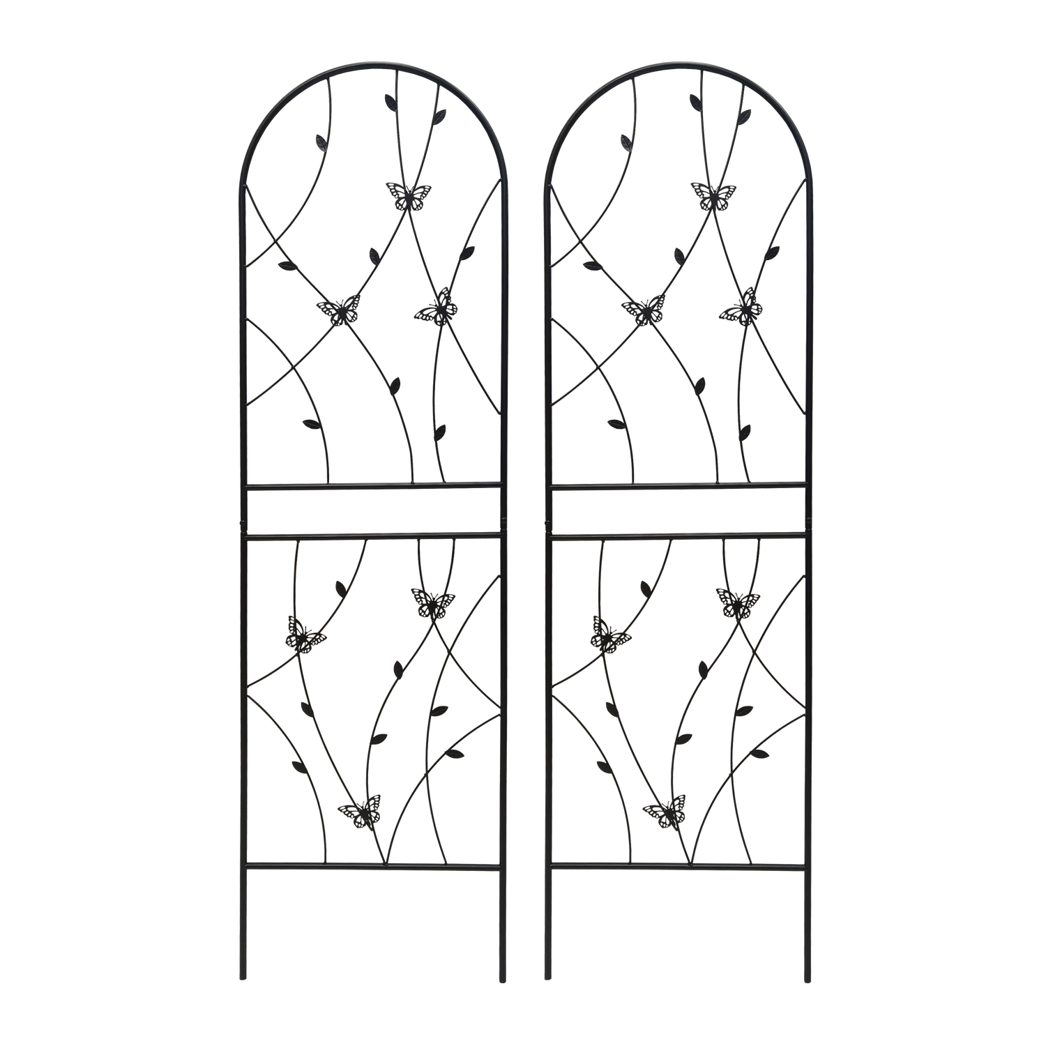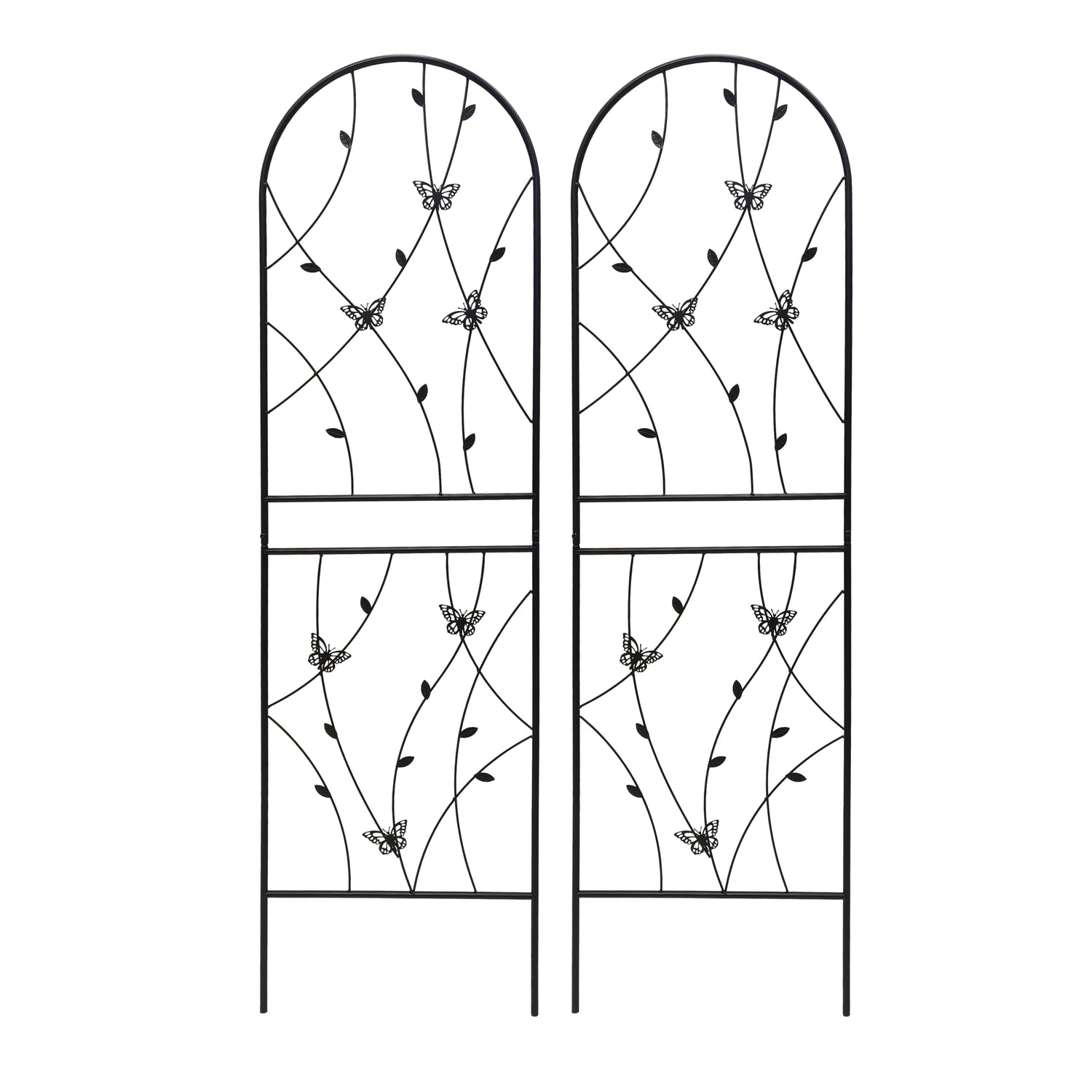 Support your climbing plants effortlessly with this 2 pack of metal garden trellises, designed for outdoor use and crafted from sturdy iron with a rustproof black powder-coated finish. Standing 71 inches tall and 19.7 inches wide, these trellises provide the perfect framework for vines, roses, cucumbers, and more, helping your plants grow upward elegantly while adding a stylish butterfly-inspired decorative touch. Easy to assemble thanks to pre-drilled holes, these lightweight yet strong trellises resist the elements and keep your garden organized year-round. Whether used individually or combined to form a screen or corner, they bring both function and beauty to your outdoor space. Elevate your garden’s growth and appearance today.
