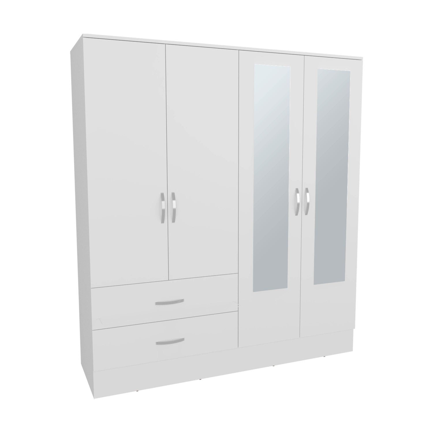 Modern white MDF armoire with dual full-length mirrors, two double-door cabinets, six adjustable shelves, and two lower drawers offers versatile bedroom storage and organization, ideal for master bedrooms or shared closet spaces.