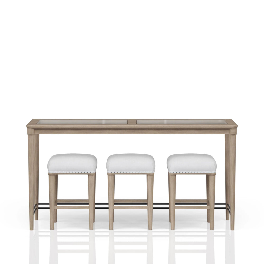Transitional console table features a sand finish with frosted glass accents and solid wood and MDF construction. Includes three 20.5-inch stools, offering casual style and versatile seating for living rooms or entryways. Durable and easy to maintain.