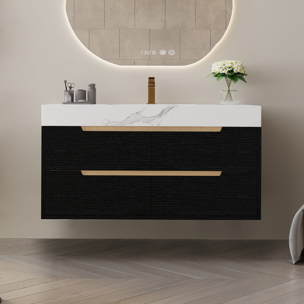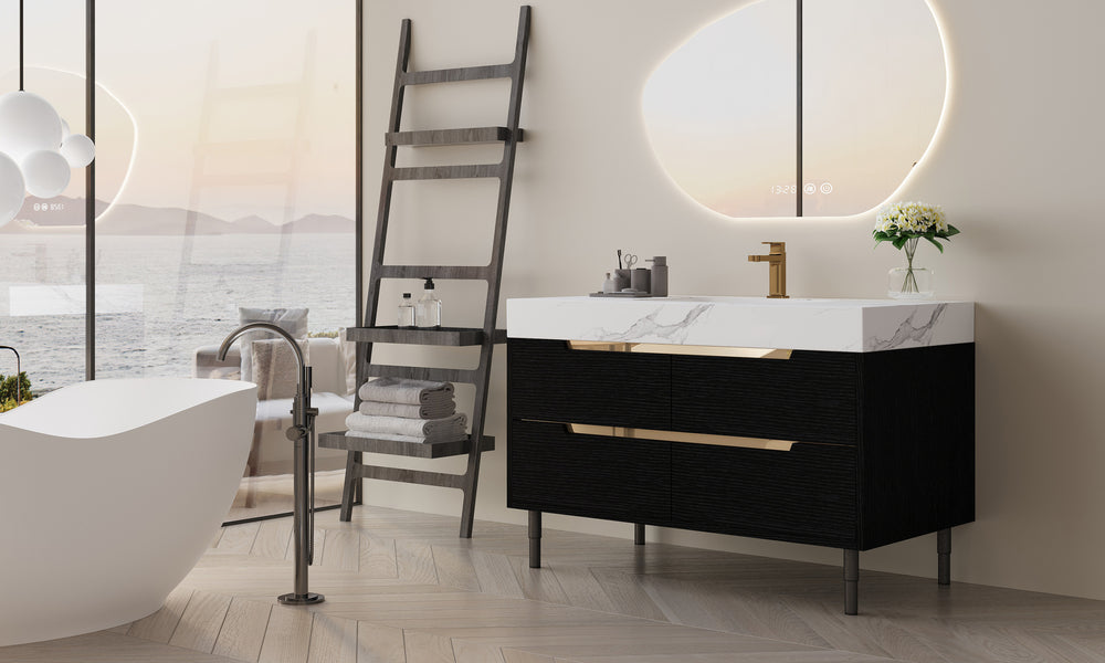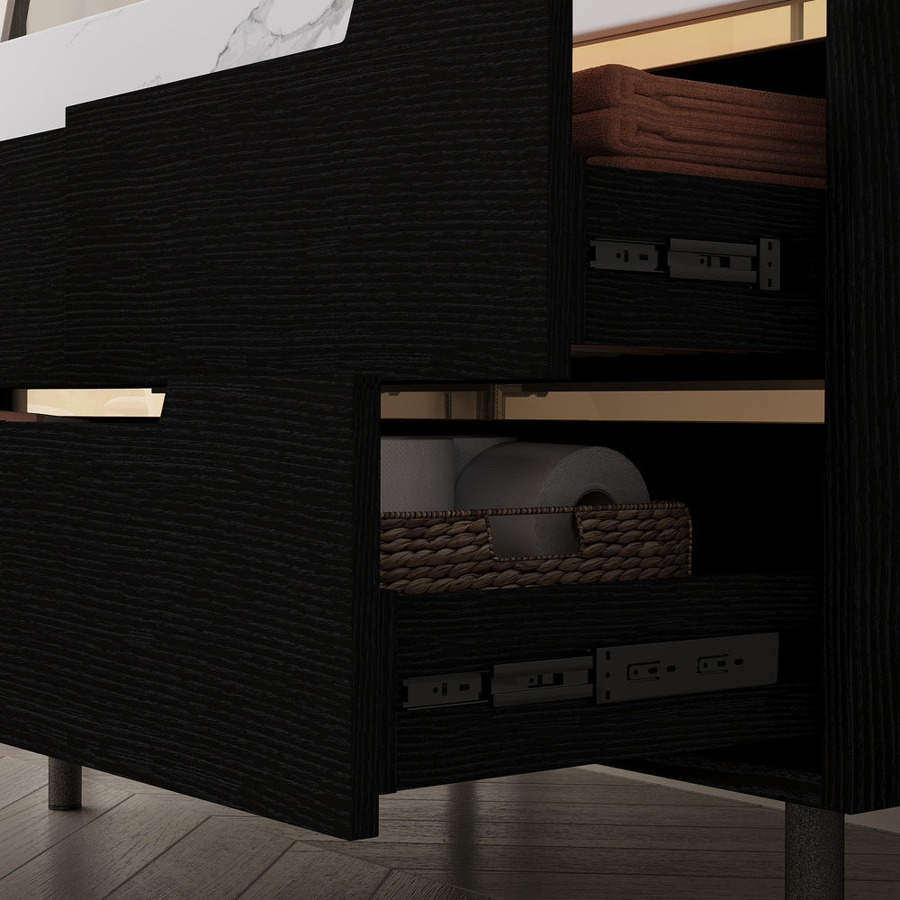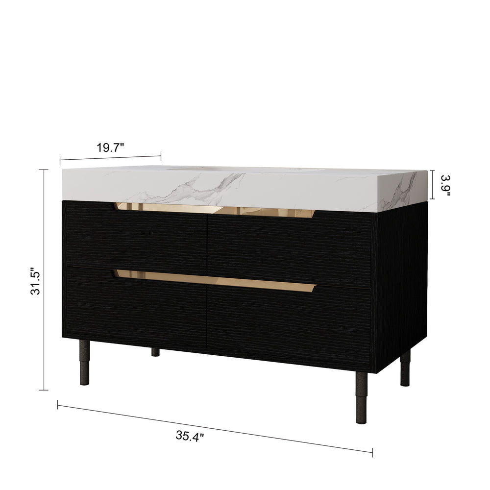Upgrade your bathroom aesthetics and functionality with this stylish 35.4-inch modern bathroom vanity. Featuring a luxurious sintered stone countertop, it offers exceptional resistance against scratches, stains, and heat for lasting beauty. The undermount ceramic sink with a sleek, overflow-free design simplifies cleaning while maintaining a minimalist look. Crafted from waterproof multi-layer solid wood, this vanity cabinet withstands high humidity, ensuring durability and structural integrity. Four soft-close drawers provide ample, organized storage for your essentials, blending convenience with quiet operation. With versatile installation options, this vanity can be free-standing or wall-mounted, adapting seamlessly to your space. The refined matte black finish and elegant hidden gold handles complement contemporary bathroom styles, making it the perfect statement piece.