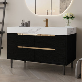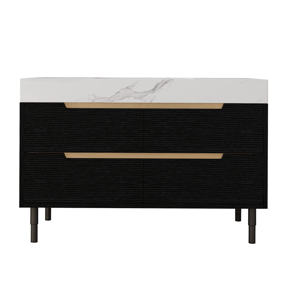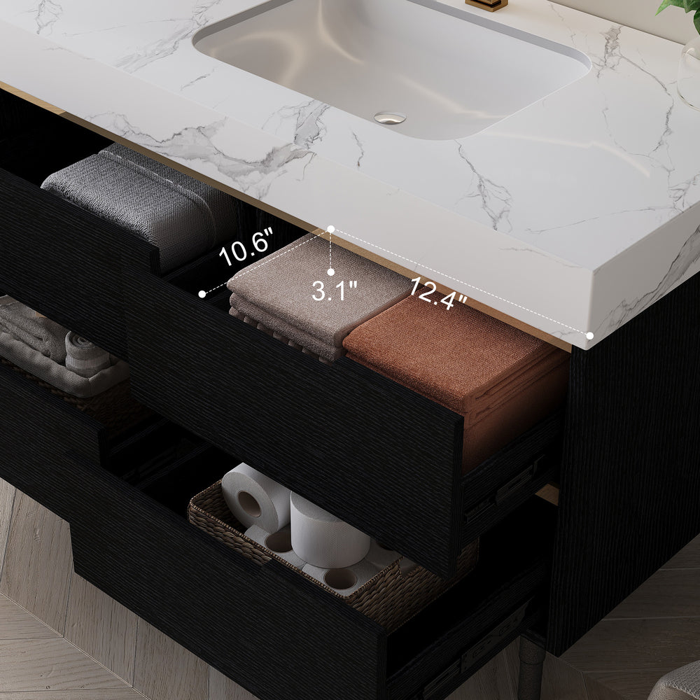 Modern bathroom vanity features a durable sintered stone countertop resistant to scratches, stains, and heat, paired with a waterproof multi-layer solid wood cabinet for humidity resistance. Includes four soft-close storage drawers and a sleek undermount ceramic sink, ideal for contemporary bathroom spaces.