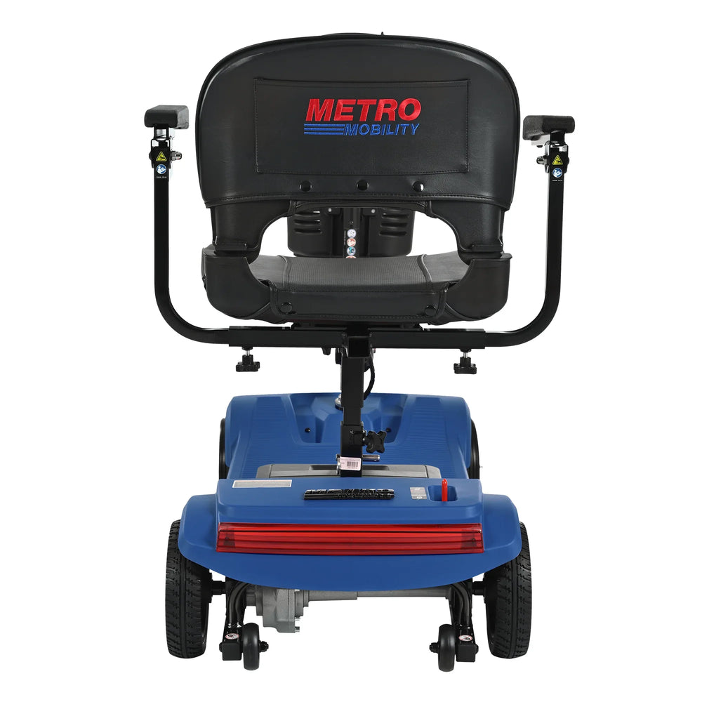Omega Lifestyles adjustable blue metal driving seat features front and rear LED lights for night safety, electromagnetic brake for easy stopping, adjustable armrests and height for comfort, removable ventilated seat for long drives, and a USB port for mobile charging on the go.