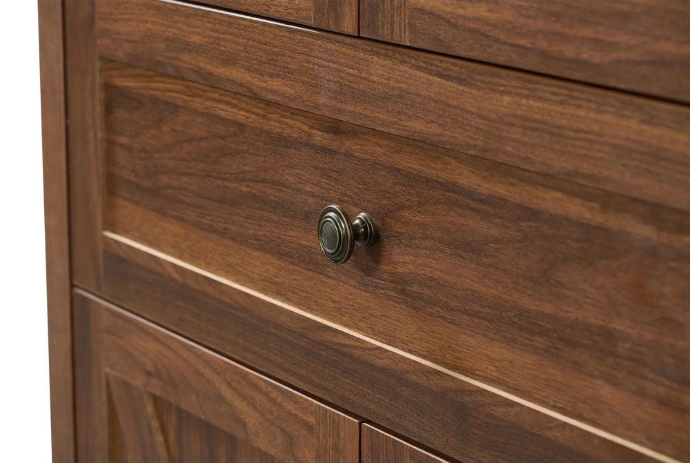 Vintage-style freestanding wood cabinet with matte walnut finish offers versatile storage for living, dining, or study spaces. Features large capacity, adjustable shelves, retro arch design, and easy-grip circular handles, blending American Traditional, Contemporary, and Rustic styles.