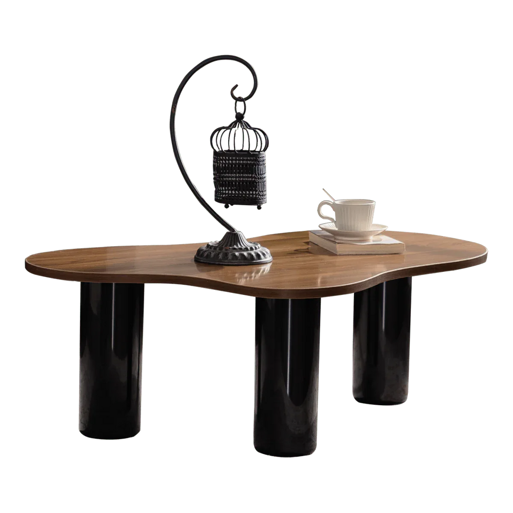 Bring a fresh, contemporary vibe to your living room with this uniquely designed cloud-shaped coffee table. Crafted from durable, eco-friendly MDF with a sleek black and wood finish, it combines style with function. The spacious, irregularly curved tabletop provides ample room for your decor, drinks, or magazines while adding a touch of artistic flair. Its sturdy H-shaped base with three cylindrical legs ensures stability without compromising on style. The smooth, high-temperature baking varnish finish offers a skin-friendly surface that's effortless to clean, maintaining a neat and polished look. Easy to assemble with included accessories and instructions, this modern coffee table is perfect for creating a welcoming centerpiece in your primary living space. Elevate your home’s atmosphere today with this functional art piece.