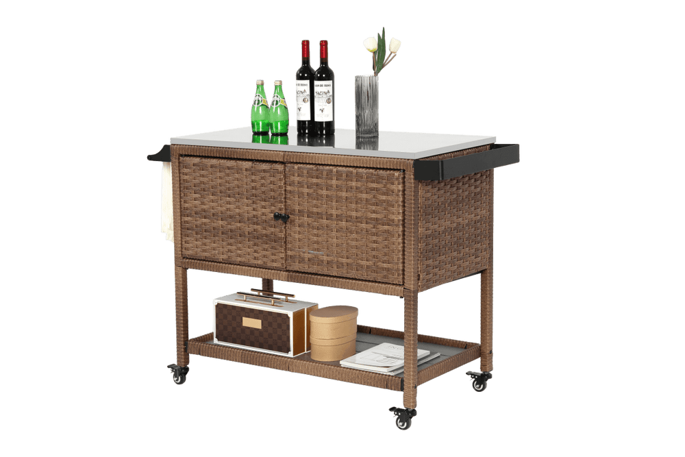 Outdoor wicker bar cart features a sturdy steel frame with weather-resistant rattan and a stainless steel tabletop with expandable shelf, offering versatile storage and rolling mobility for garden, patio, or poolside entertaining and beverage service.