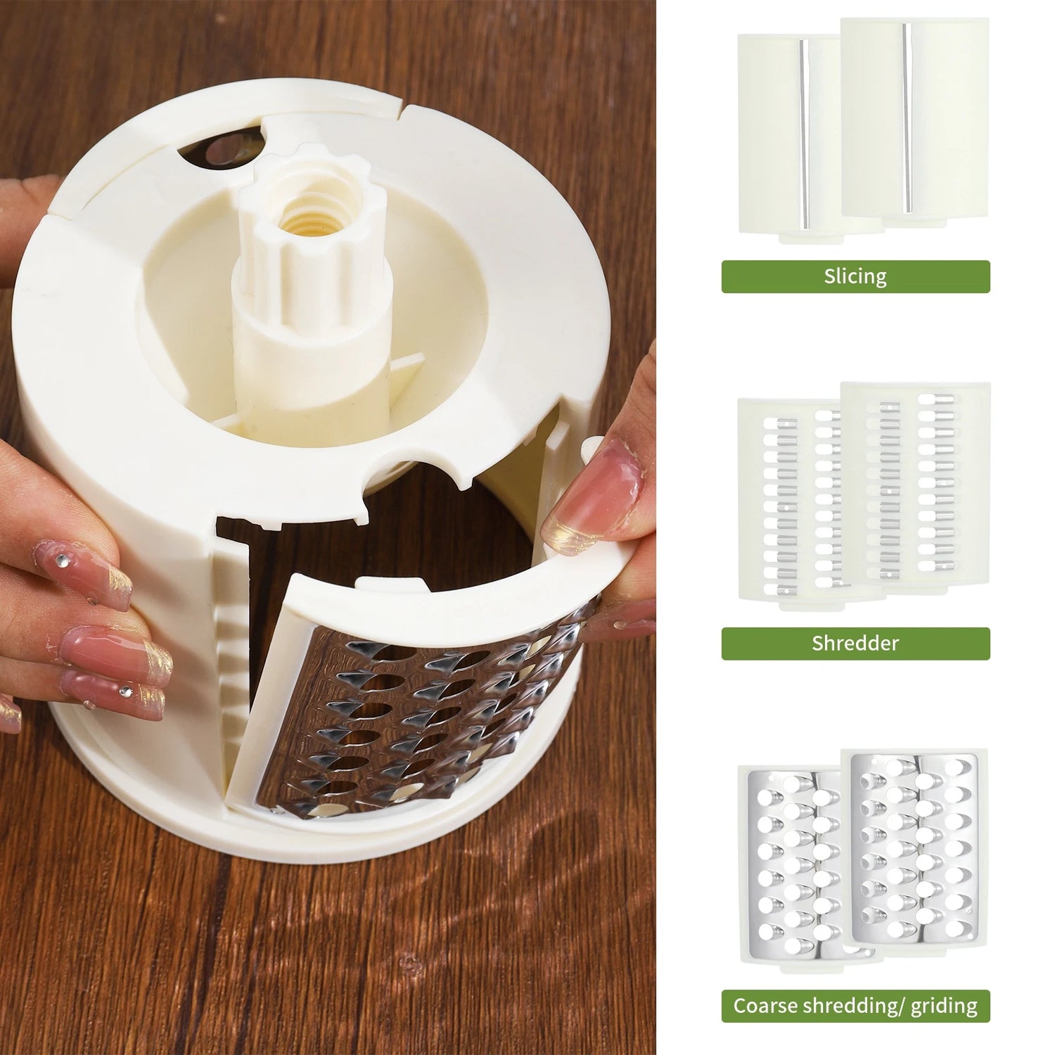 - Three Interchangeable Blades: For shredding, slicing, and grinding various foods.