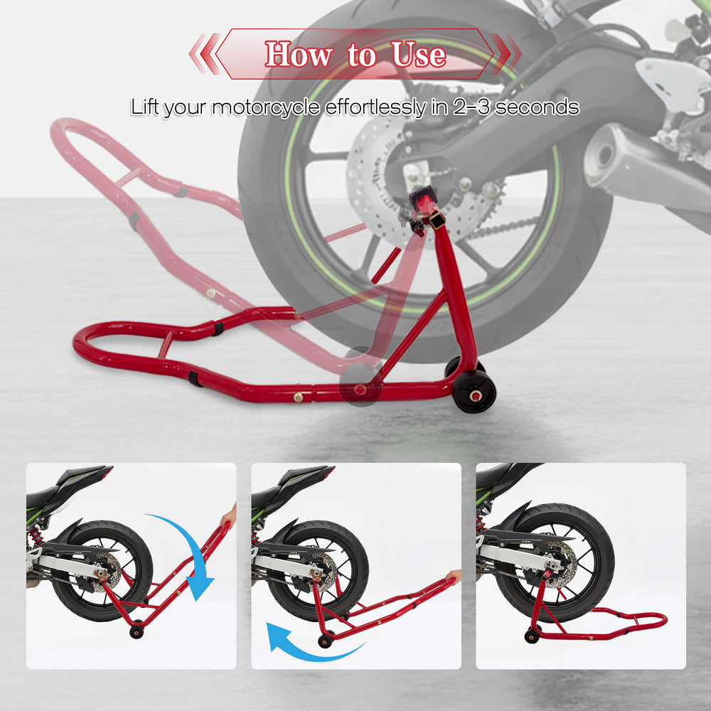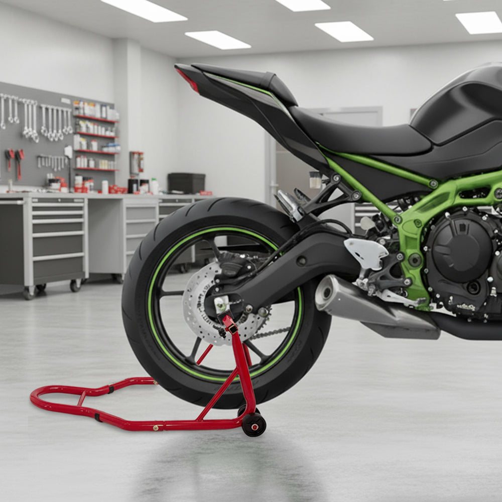 Maintain and service your sport bike safely and efficiently with this rugged motorcycle rear paddock stand. Constructed from premium industrial-grade steel and finished with a corrosion-resistant red powder coat, it supports up to 850 lbs, providing unmatched durability for indoor and outdoor use. The adjustable U-shaped front fork head and L-shaped rear swingarm head, both equipped with protective rubber pads, fit a wide range of motorcycles from top brands like Yamaha, Honda, Kawasaki, Suzuki, and BMW. Its reinforced triangular base and smooth-rolling PP caster wheels ensure superior stability and effortless mobility, so you can perform maintenance, tire changes, or storage tasks with confidence. Easy to assemble and designed for convenient storage, this stand is an essential tool for any motorcycle enthusiast or professional mechanic. Elevate your bike care routine today with dependable support and versatile fit.