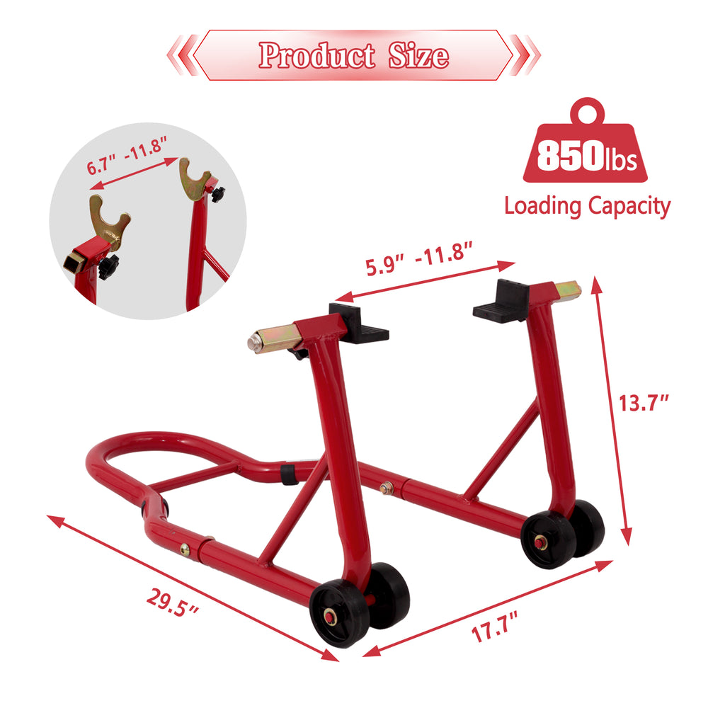 Heavy-duty red metal motorcycle stand supports up to 850 lbs with corrosion-resistant powder-coat finish. Features adjustable U-shaped fork and L-shaped swingarm heads with rubber pads for scratch-free fit, stable triangular base, and smooth caster wheels for easy maintenance and storage.
