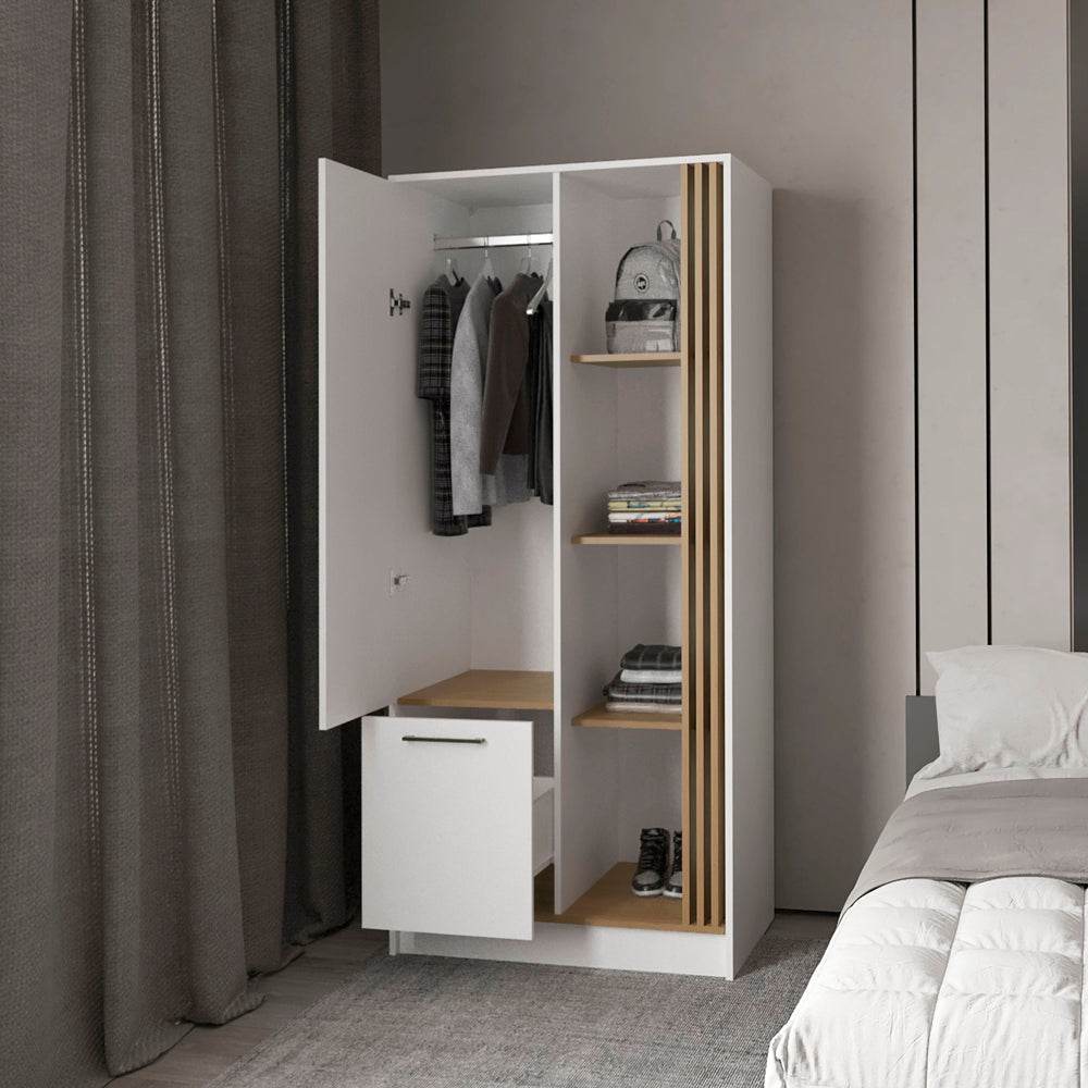 Modern bedroom wardrobe organizer with two doors, hanging rod, and multiple open shelves for clothes and accessories. Made of durable particle board with scratch-resistant melamine finish, it offers practical storage and sleek design, ideal for maintaining bedroom organization.