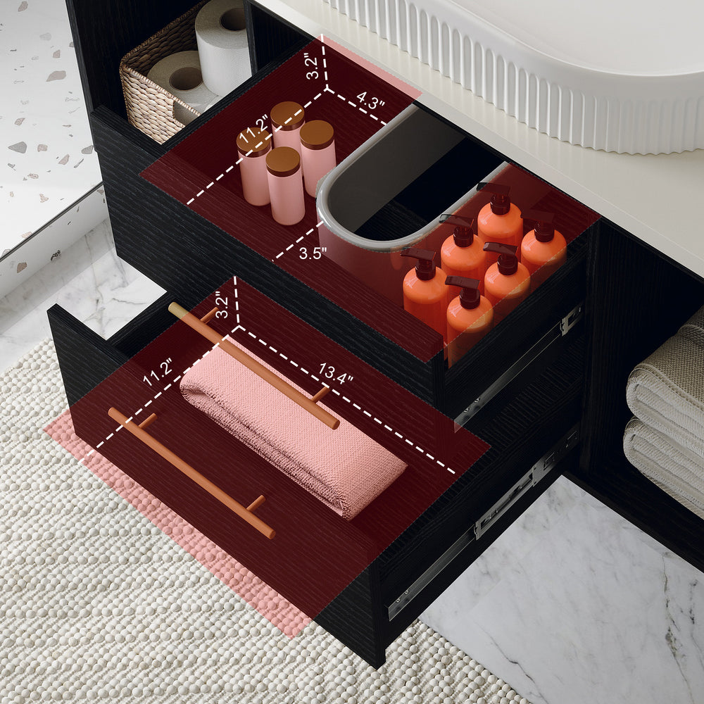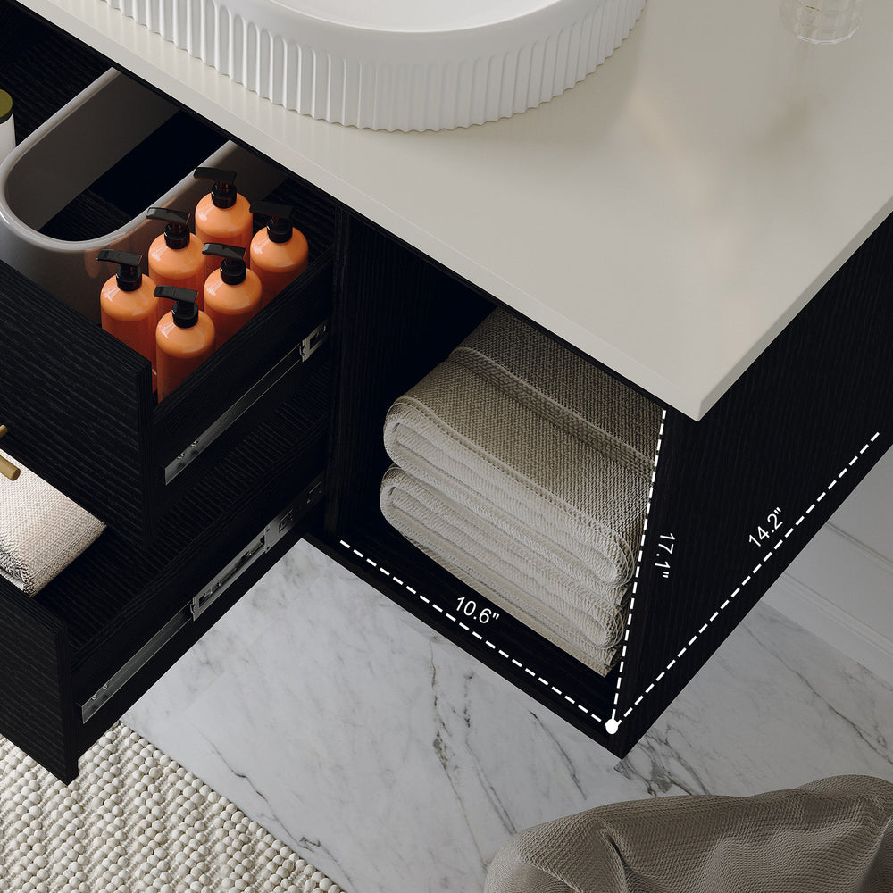 Upgrade your bathroom with this sleek 40-inch wall-mounted vanity, perfectly designed for contemporary spaces. The floating installation not only adds a minimalist, stylish look but also frees up floor space, making cleaning easier in small to medium bathrooms, condos, or apartments. Featuring an elegant oval ceramic sink with vertical groove detailing, this vanity blends functionality with modern aesthetics. Crafted from durable multi-layer solid wood with a moisture-resistant finish, it stands up to the humidity of bathroom environments while providing ample storage through soft-close drawers and an open shelf. Bring both luxury and practicality to your space—transform your bathroom today.