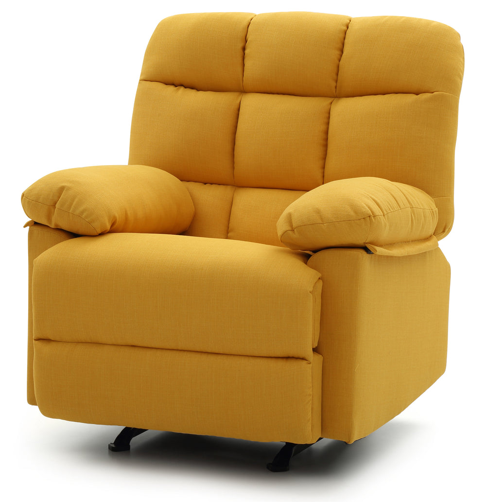 Modern yellow fabric recliner features padded foam arms for enhanced comfort and support, sized for easy fit in cozy spaces. Ideal for solo relaxation or reading, this stylish chair adds a vibrant flair and assembles effortlessly for immediate use.