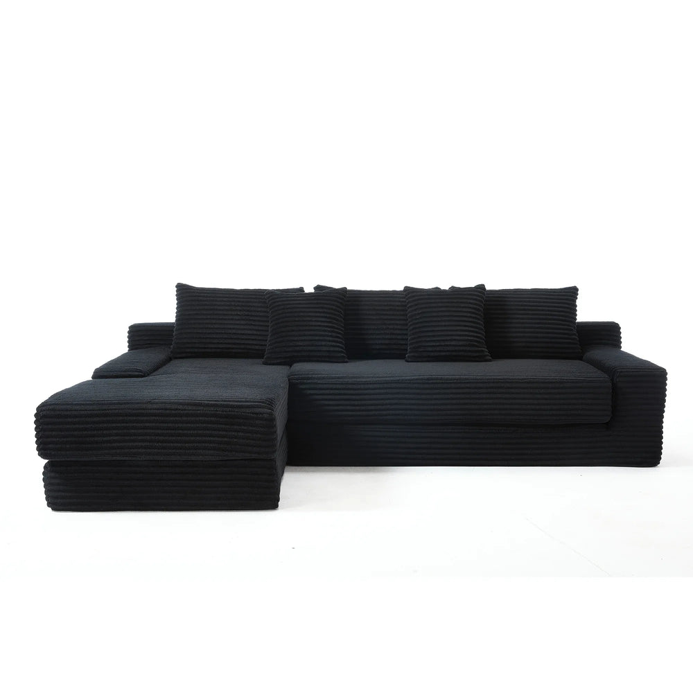Elevate your living room with this sleek black corduroy sectional couch, designed for ultimate comfort and style. Featuring cloud-like memory foam cushions, it contours to your body for superior support during long movie nights or relaxing afternoons. The sturdy industrial steel frame ensures lasting durability while maintaining a modern aesthetic. With its innovative compression design, this couch arrives vacuum-packed for easy setup—just unpack, watch it expand, and enjoy. Its modular L-shaped layout fits perfectly in small spaces, offering flexible seating arrangements for apartments or dorm rooms. Bring home this stylish, space-saving sectional and transform your lounge experience today.