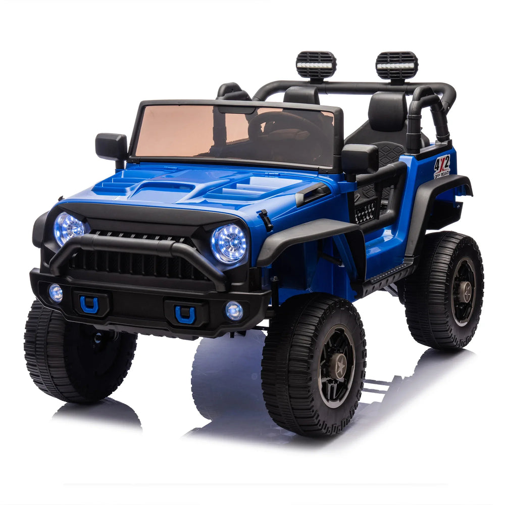 This two-seater kids ride-on truck offers one-button start, forward and backward control, four-wheel suspension, and speeds up to 3.4 MPH. It features LED lights, music with MP3 and Bluetooth, independent seat belts, and a Bluetooth remote for parental control, ensuring fun and safe off-road play for children aged 3 and up.