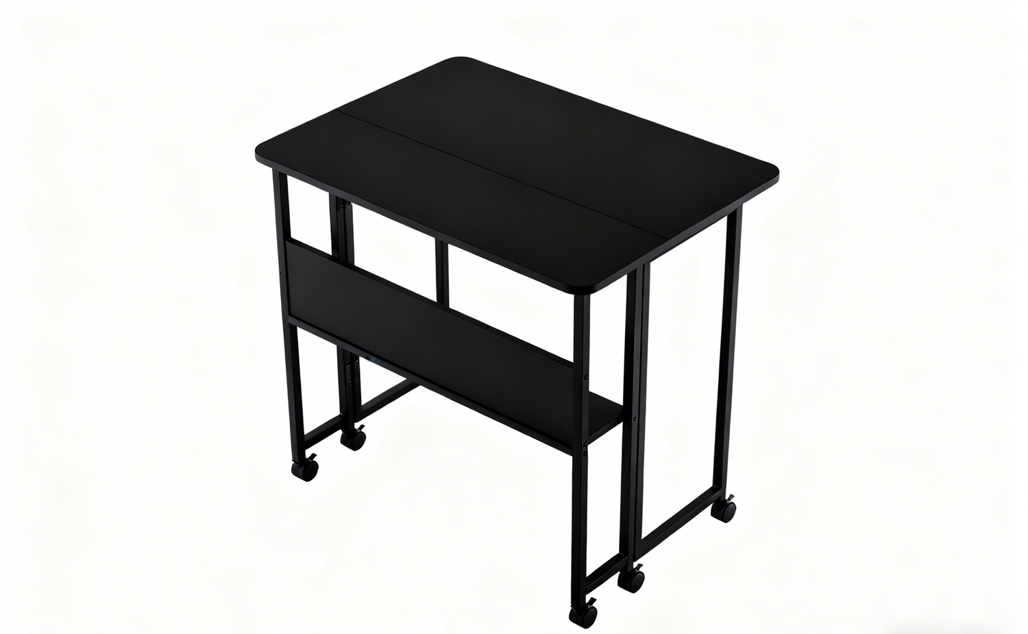 Small folding desk features a sturdy MDF build with laminated finish and rolling casters for easy mobility. Its compact size and foldable design offer convenient storage and versatile use as a computer or study desk in small spaces.