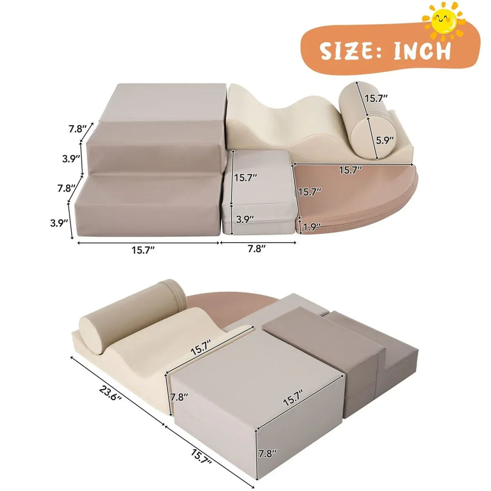 - 6-Piece Set: Includes staircase, square mat, rectangular mat, fan-shaped mat, wavy climbing mat, and cylinder.
