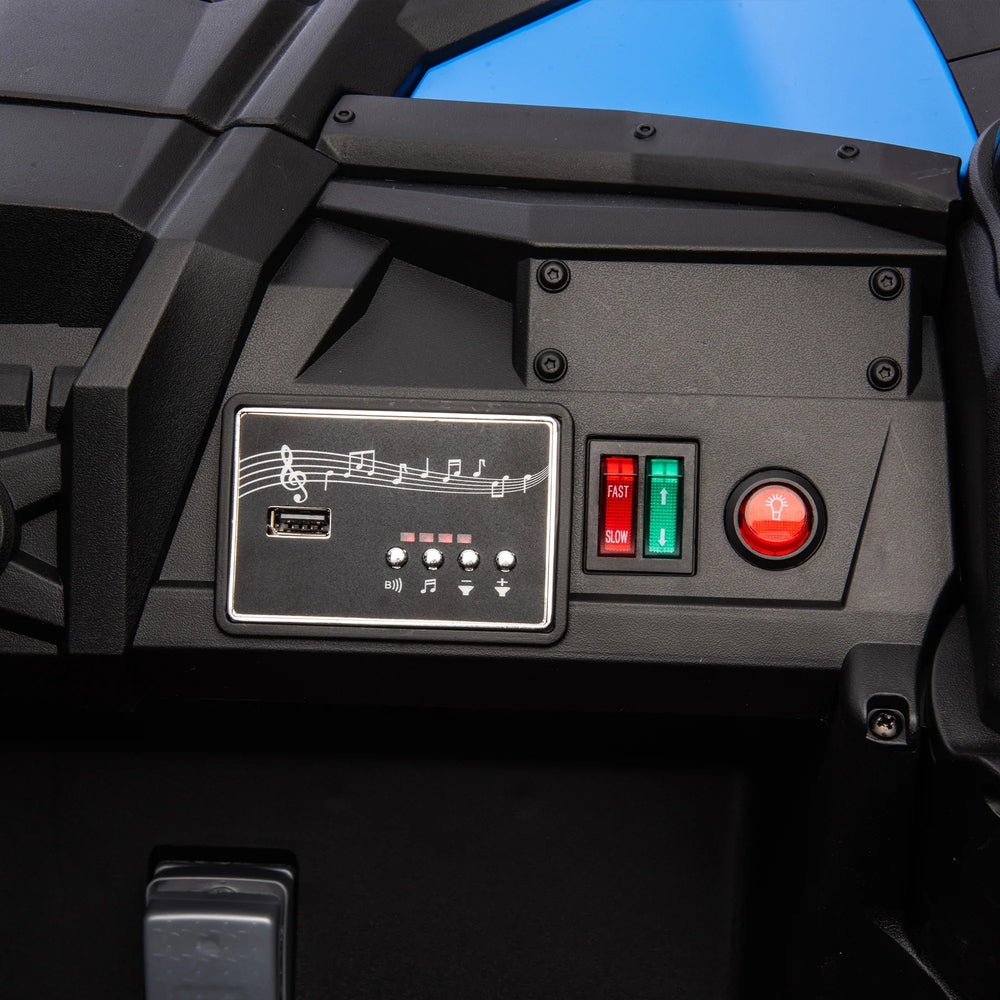 Let your children embark on thrilling adventures with this durable and feature-packed two-seater kids ride-on UTV. Designed with safety and fun in mind, the roomy double seat invites kids to ride alongside a friend, fostering friendship and joyful outdoor play. The innovative parental remote control lets adults guide or stop the vehicle remotely for peace of mind. A gentle slow-start system ensures a smooth, comfortable takeoff, while the advanced four-wheel suspension minimizes bumps on all terrains for a cloud-like ride. Equipped with large wheels and a front anti-collision bar, this ride-on vehicle is built to handle rough paths safely. Kids will also enjoy built-in music, Bluetooth connectivity, and adjustable volume, making every ride entertaining. Practical storage space keeps toys and snacks close at hand. Ready to energize playtime and inspire endless fun, this ride-on UTV is perfect for children ages 3 and up. Elevate their outdoor adventures today.