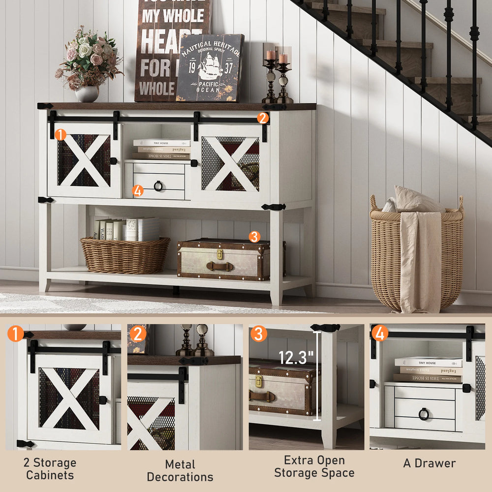 QiaoShiRen farmhouse entryway table features American country style with two sliding barn doors, one drawer, and spacious open storage for organized living spaces. Its durable wooden construction and smooth rails offer versatile use as a console or display table.