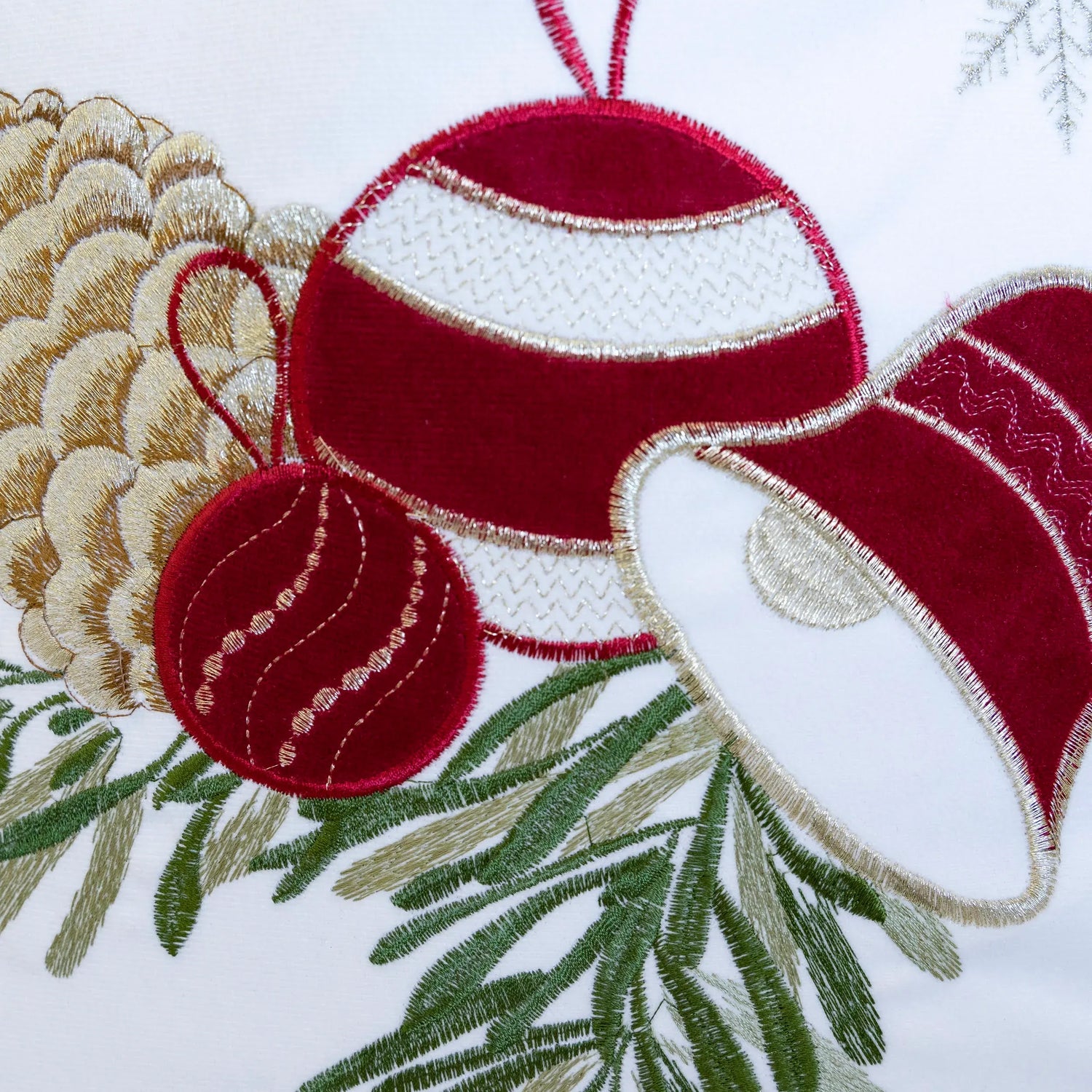 • Festive Embroidery: Pinecones, bells, and ornament designs on snowy white velvet
