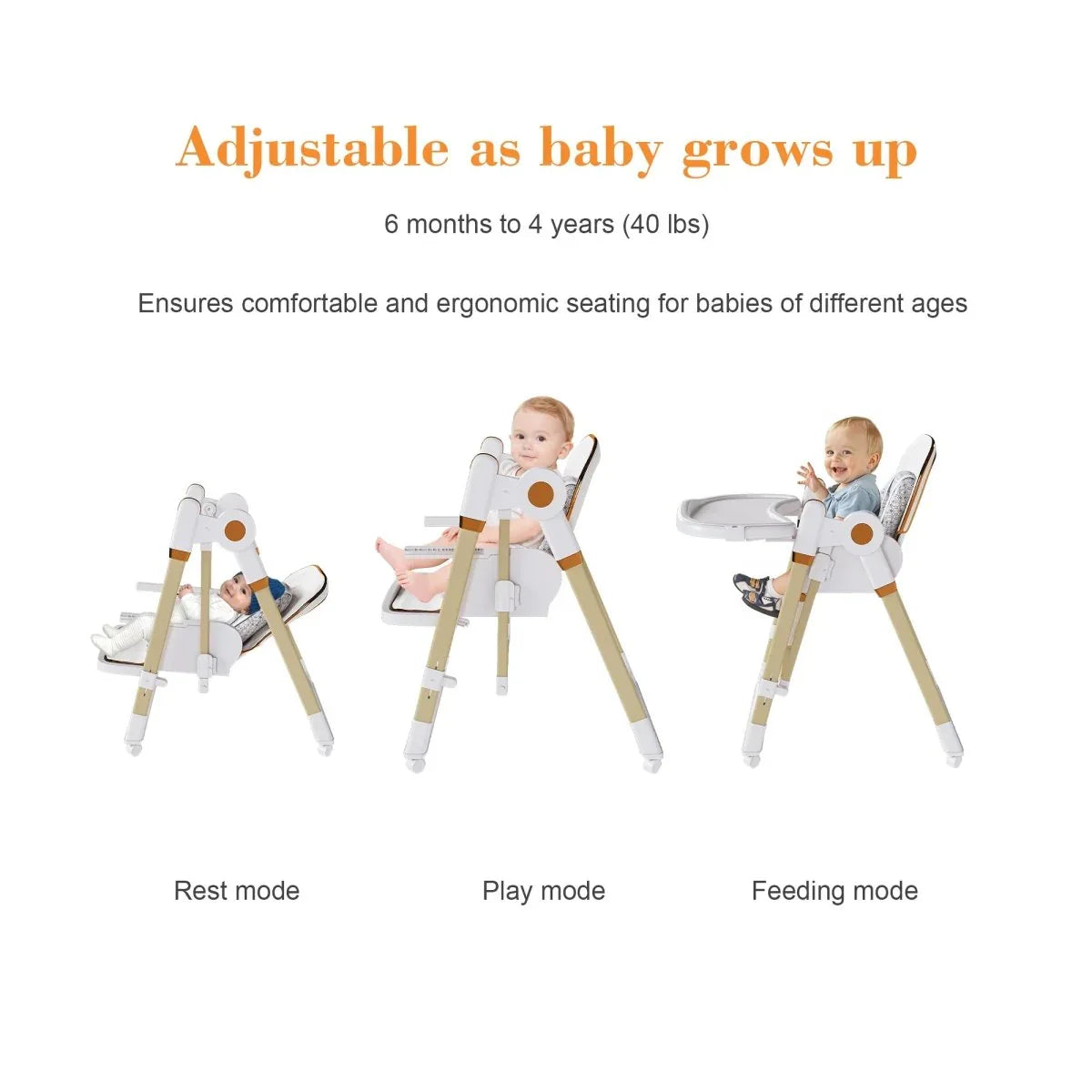 - Adjustable 2-Tier Tray: Detachable meal zone and activity area with 3 positions.