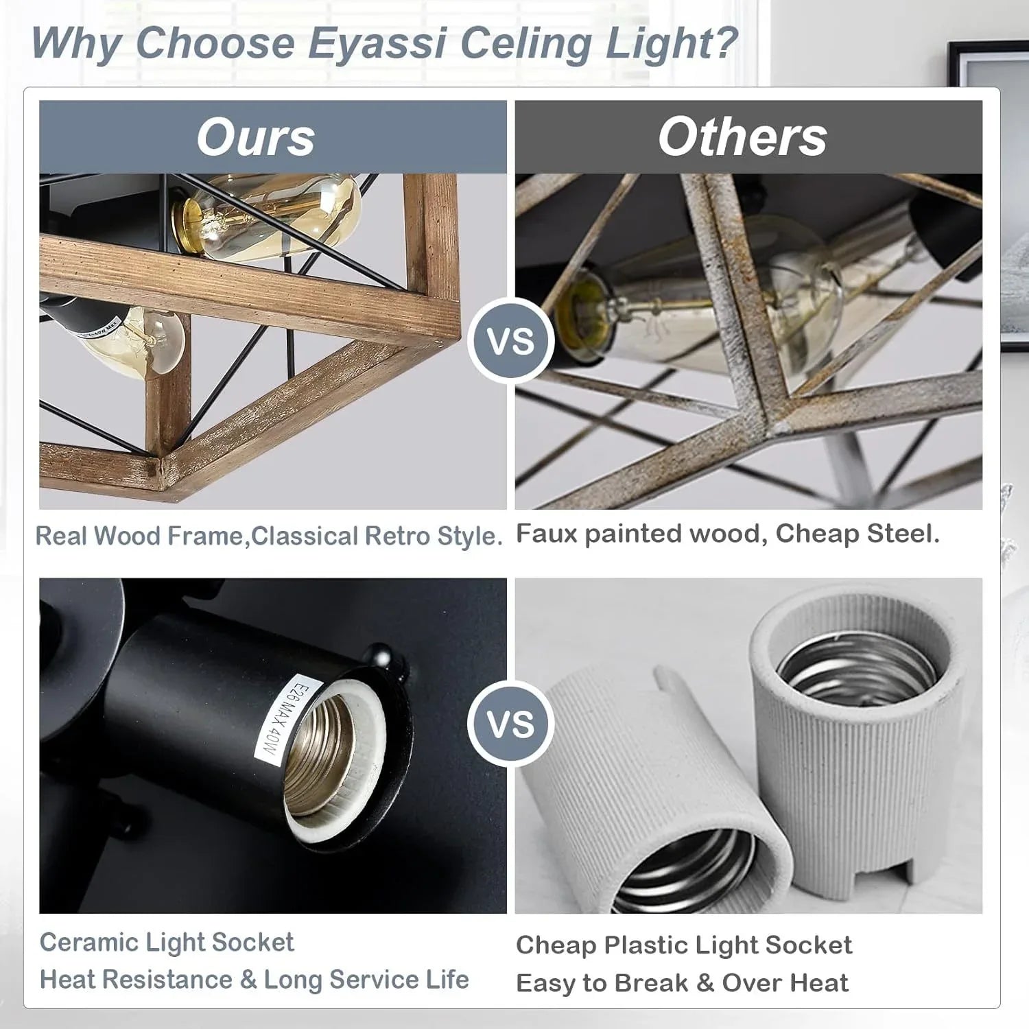 Bring timeless farmhouse charm and modern industrial style into your living spaces with this 4-light wooden flush mount ceiling fixture. Crafted from premium natural wood and sturdy metal, it combines rustic warmth with durable construction. The black metal canopy contrasts beautifully with the wood frame, offering a vintage yet contemporary look that complements kitchens, living rooms, bedrooms, hallways, and more. Featuring ceramic sockets that resist high temperatures and ensure long-lasting safety, this ceiling light provides warm, inviting illumination to create a cozy atmosphere throughout your home. Its compact size fits close to the ceiling, making it ideal for areas with low ceilings while delivering ample light. Easy to install with all necessary accessories included, this semi-flush mount fixture is a perfect upgrade to your farmhouse or rustic décor. Elevate your space with stylish, energy-efficient lighting today.
