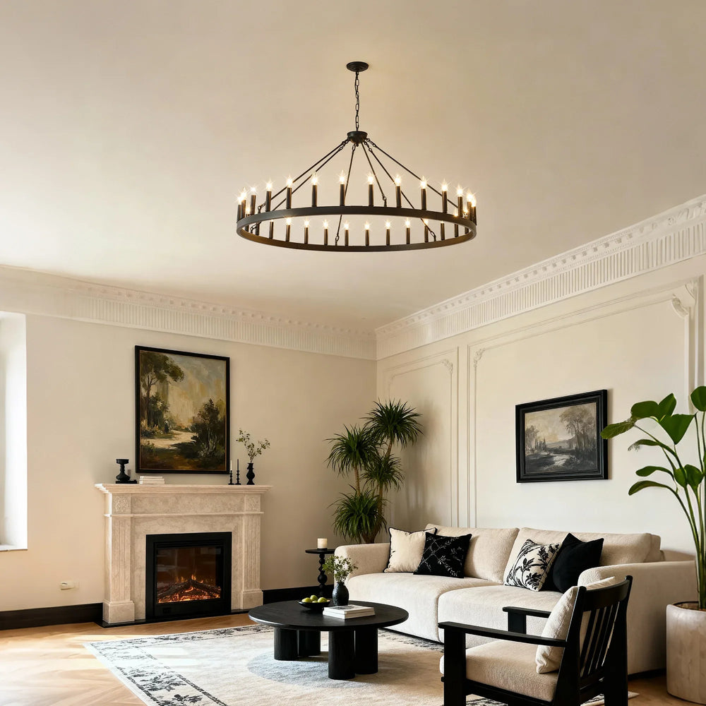 Bring timeless charm and industrial elegance to your home with this 53.15-inch matte black wagon wheel chandelier. Crafted from sturdy iron and metal, its vintage-inspired round frame seamlessly blends American traditional and contemporary styles. Featuring 30 E12 lamp holders, this ceiling light delivers ample illumination, perfect for large dining rooms, kitchens, living rooms, or bar areas. The adjustable height with three included chains lets you customize the drop up to 69.44 inches, ensuring the perfect fit for your space. Easy to install and hard-wired for a seamless finish, this chandelier combines style and function to transform your interior. Please note bulbs are not included, allowing you to choose your preferred LED options to set the ideal ambiance. Add a striking centerpiece that complements both classic and modern décor. Illuminate your home with character—upgrade your lighting today.