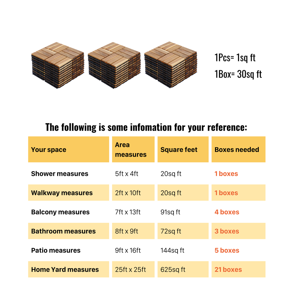 Upgrade your garden, patio, or balcony with these stylish and durable interlocking deck tiles crafted from premium yellow Acacia wood. Each 12-inch by 12-inch tile features a checker pattern design that adds a classic American traditional look to any outdoor space. The tiles are sanded smooth and treated with water-based oil, providing natural waterproofing and resistance against mildew and mold. The innovative two-part construction—with 0.47-inch thick wood and 0.28-inch thick plastic bases—ensures excellent drainage, keeping your floors dry even during rainy seasons. Easy to install without tools, these DIY deck tiles snap together effortlessly using a rubber hammer, and can be cut to fit corner and tight spaces perfectly. Lightweight yet sturdy, they deliver a practical and elegant flooring solution that transforms your outdoor area into a cozy retreat. Elevate your outdoor décor and functionality today.