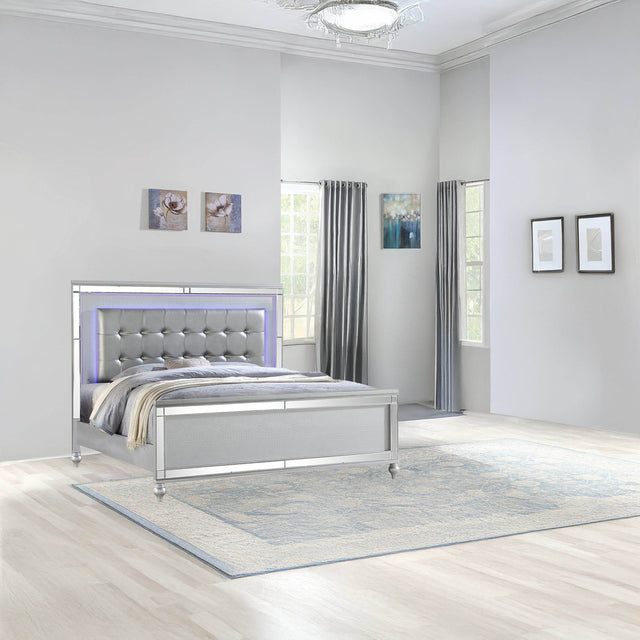 Elevate your bedroom ambiance with the Sterling Queen Bed, featuring a sleek silver wood frame and plush PU upholstered headboard accented by crystal tufting. Crafted from solid wood and MDF, this bed combines durability with contemporary style to transform your space. The integrated LED lighting in the headboard offers customizable brightness, perfect for reading or creating a relaxing atmosphere. Its refined design and subtle glam make it a standout centerpiece that balances comfort and sophistication. Measuring 64 inches long by 86 inches wide and standing 63 inches tall, this queen-sized bed provides ample space and stature to refresh your room’s look. Add a touch of modern luxury and functional style—upgrade your bedroom setting with the Sterling Bed today.