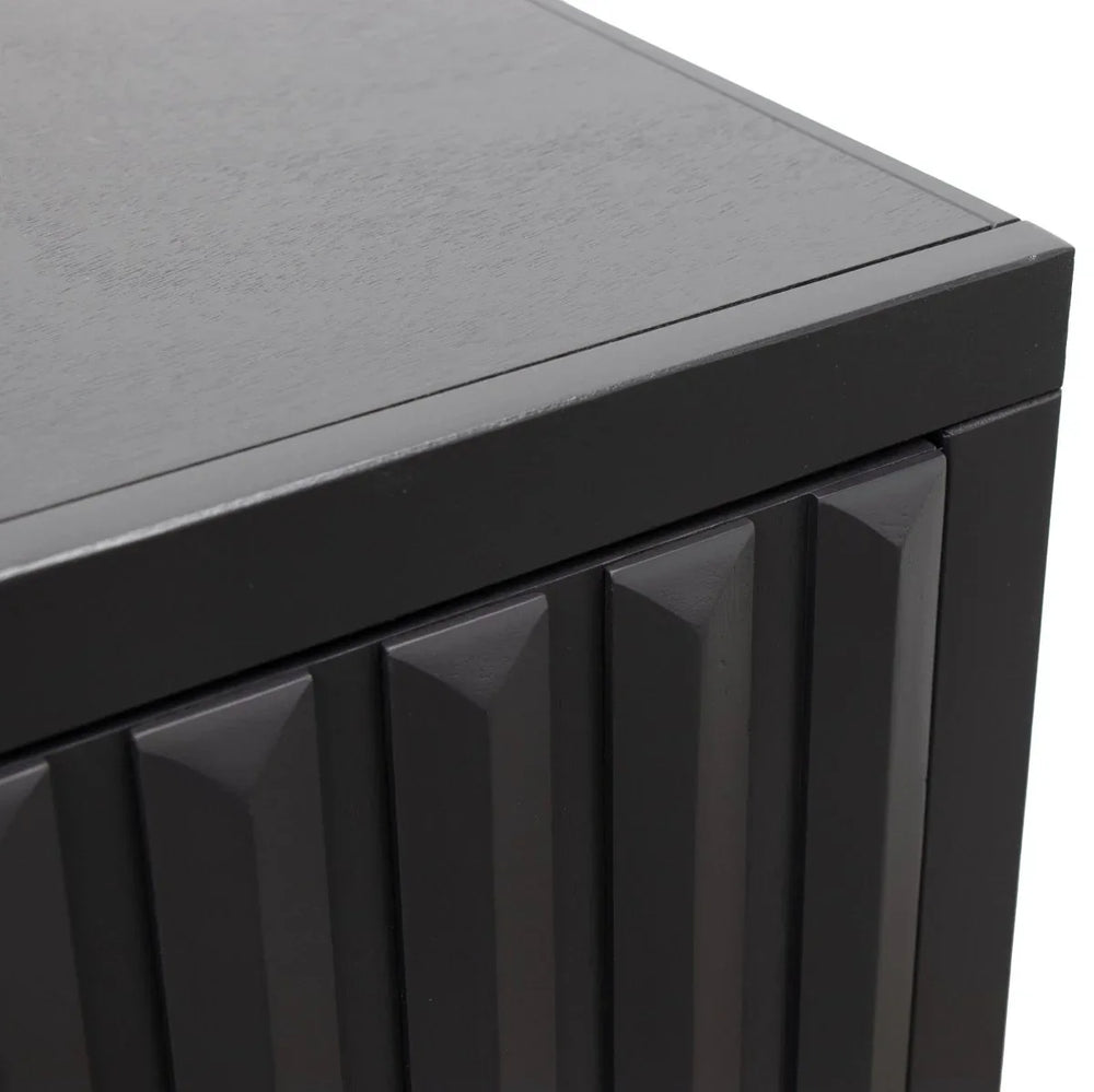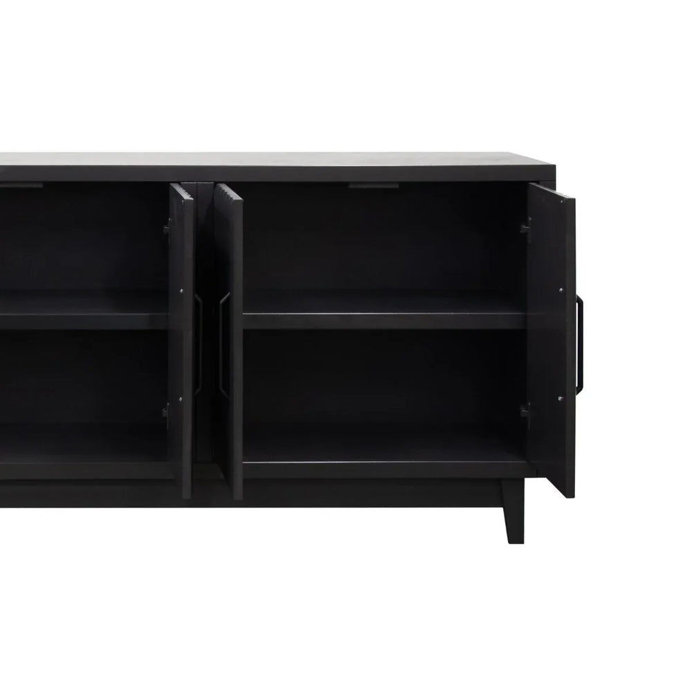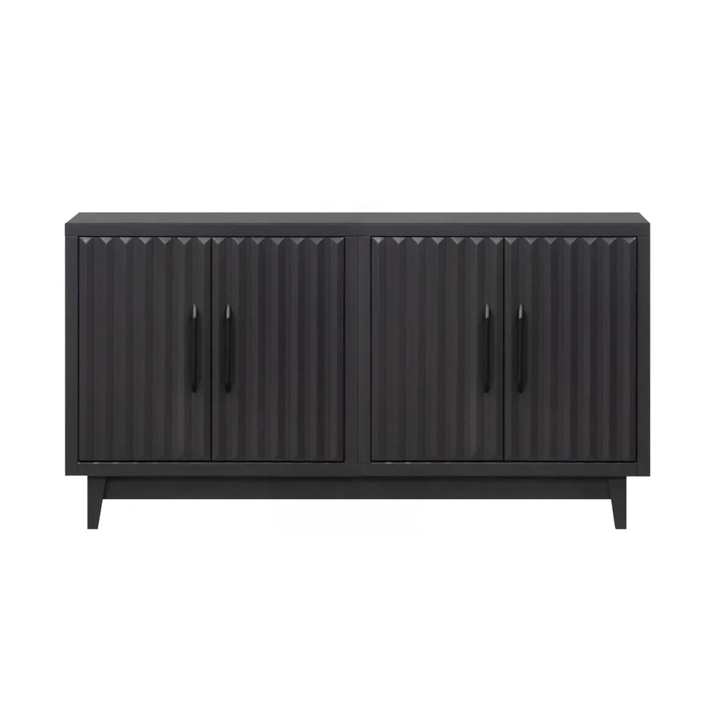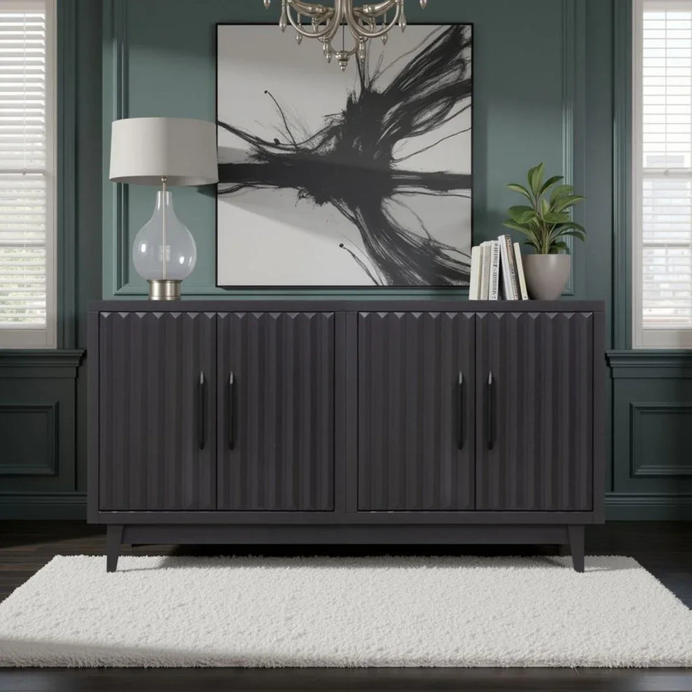 Radiance 64 inch Four Door Console features poplar solids and okoume veneers with a black finish, matte black hardware, tapered legs, and fluted doors concealing ample storage. Ideal for organizing media and decor with no assembly required.
