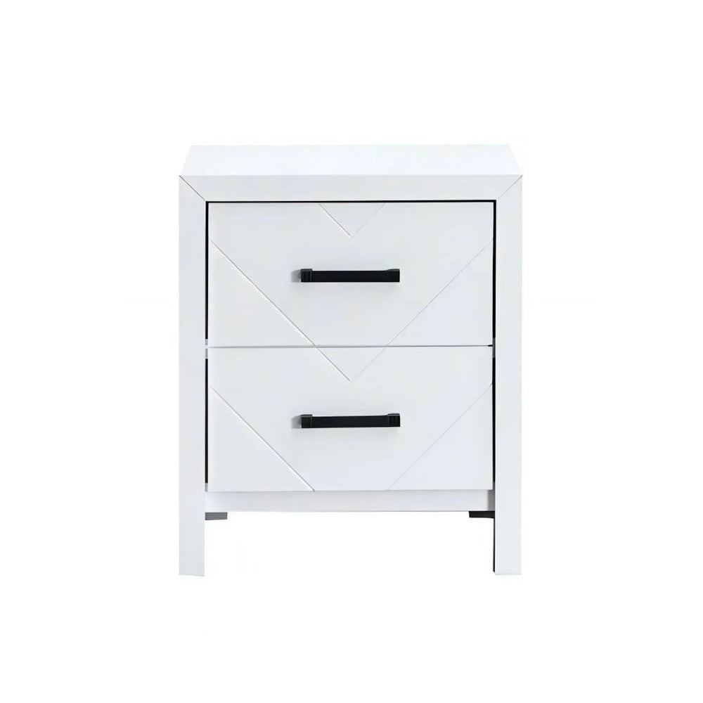 Omega Lifestyles nightstand features white wood and manufactured wood construction with V-shaped embossed drawer fronts, two dovetailed drawers with center-mounted guides and safety stops for smooth operation, and black removable handles, delivering functional storage and stylish bedroom organization.