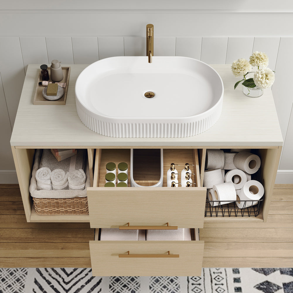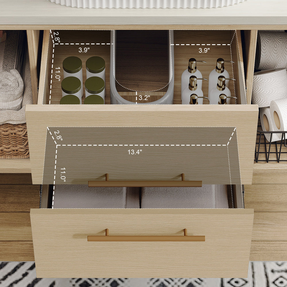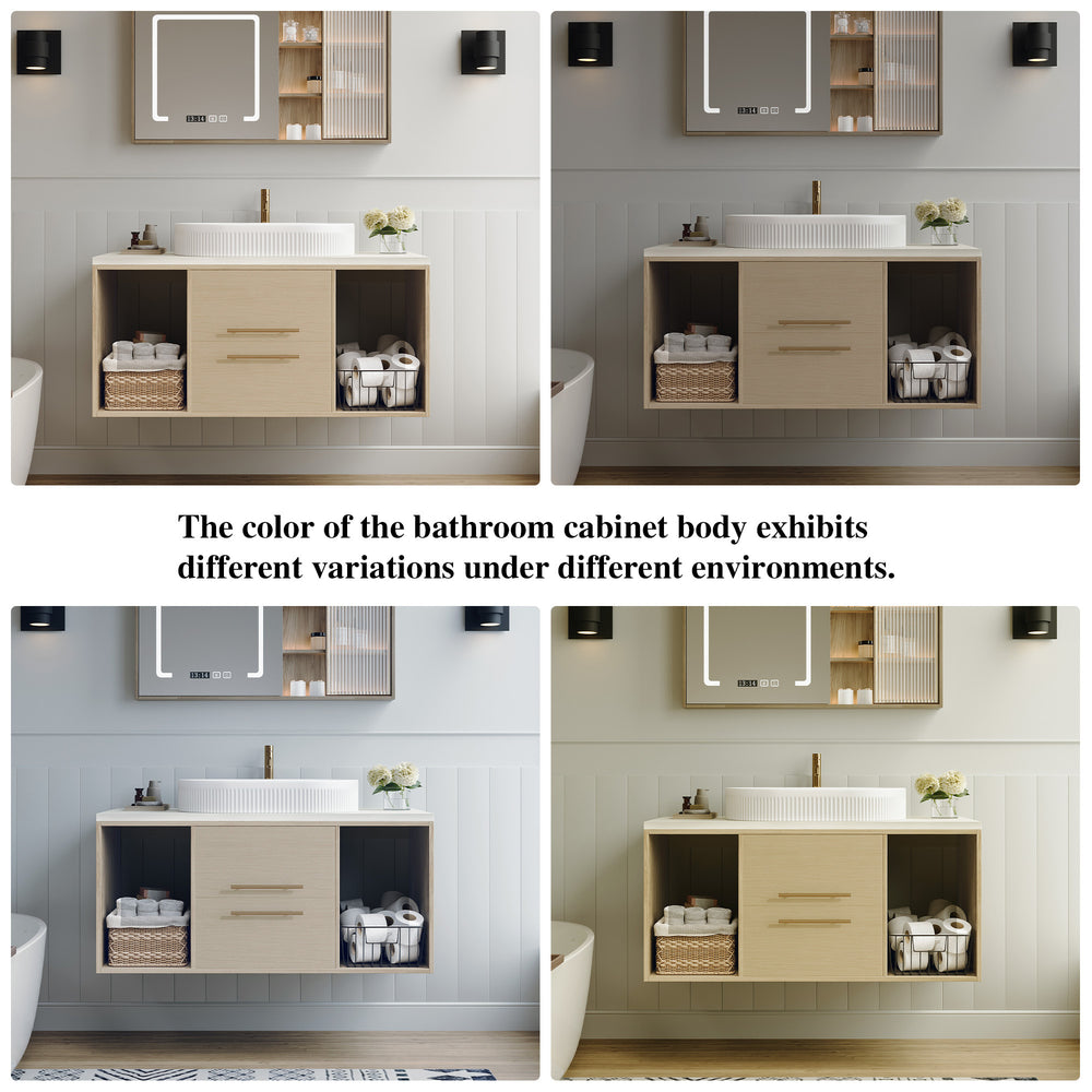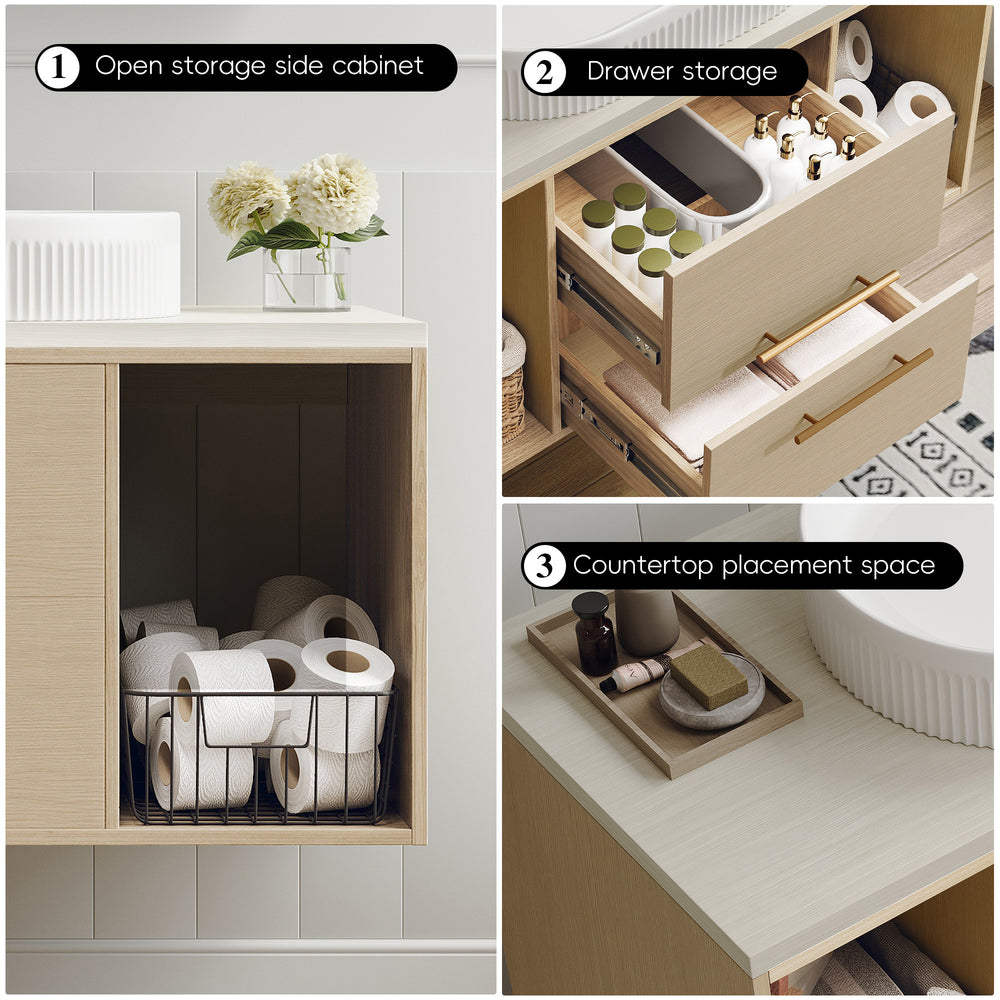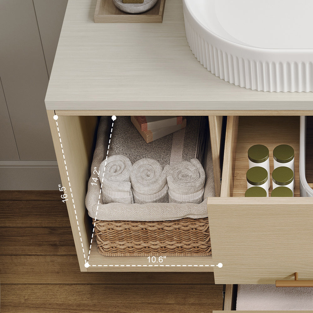 Maximize style and functionality in your bathroom with this contemporary 39.3-inch wall-mounted vanity. Featuring a sleek floating design, it opens up floor space for easier cleaning and a minimalist aesthetic ideal for small to medium bathrooms, apartments, or urban living. The elegant oval ceramic sink includes refined vertical groove details, blending durability with modern charm. Crafted from multi-layer solid wood with an 18mm plywood core, this vanity guarantees strength and lasting performance. The natural, paint-free 15mm wood countertop is moisture-resistant, perfect for humid bathroom environments. Soft-close drawers and open shelves provide versatile storage options, balancing hidden and display space. With an adjustable 31.5-inch drain pipe and compatibility with standard 1.38-inch single-hole faucets, installation is flexible and convenient. Refresh your bathroom with durable luxury and smart design—make this floating vanity your next upgrade.